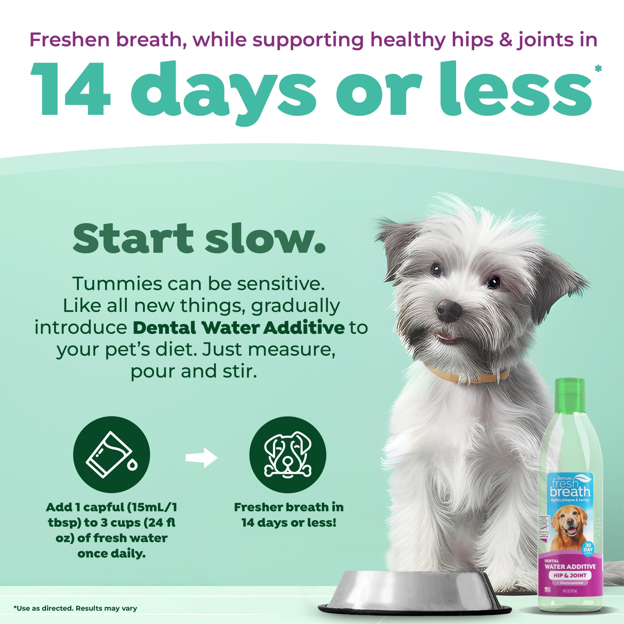 Happy & Healthy: Dogs with sensitive stomachs or new to Fresh Breath for Dogs should start with 1/2 the recommended dose.