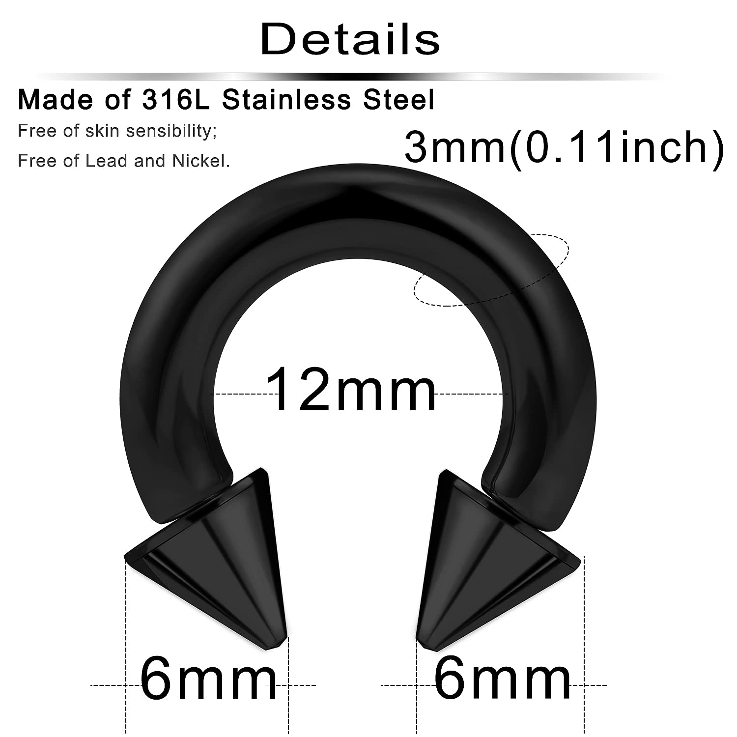 Thickness: 8G (3mm); Spike Diameter: 6mm; Inner Diameter: 12mm (1/2inch); Color: Black.