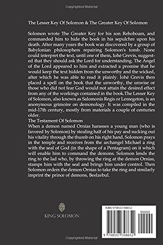 The Lesser Key Of Solomon & The Greater Key Of Solomon Solomon wrote The Greater Key for his son Rehoboam, and commanded him to hide the book in his sepulchre upon his death. After many years the book was discovered by a group of Babylonian philosophers repairing Solomon's tomb. None could interpret the text, until one of them, Iohé Grevis, suggested that they should ask the Lord for understanding. The Angel of the Lord appeared to him and extracted a promise that he would keep the text hidden from the unworthy and the wicked, after which he was able to read it plainly. Iohé Grevis then placed a spell on the book that the unworthy, the unwise or those who did not fear God would not attain the desired effect from any of the workings contained in the book.The Lesser Key of Solomon, also known as Salomonis Regis or Lemegeton, is an anonymous grimoire on demonology. It was compiled in the mid-17th century, mostly from materials a couple of centuries older. The Testament Of Solomon When a demon named Ornias harasses a young man (who is favored by Solomon) by stealing half of his pay and sucking out his vitality through the thumb on his right hand, Solomon prays in the temple and receives from the archangel Michael a ring with the seal of God (in the shape of a Pentagram) on it which will enable him to command the demons. Solomon lends the ring to the lad who, by throwing the ring at the demon Ornias, stamps him with the seal and brings him under control. Then Solomon orders the demon Ornias to take the ring and similarly imprint the prince of demons, Beelzebul.