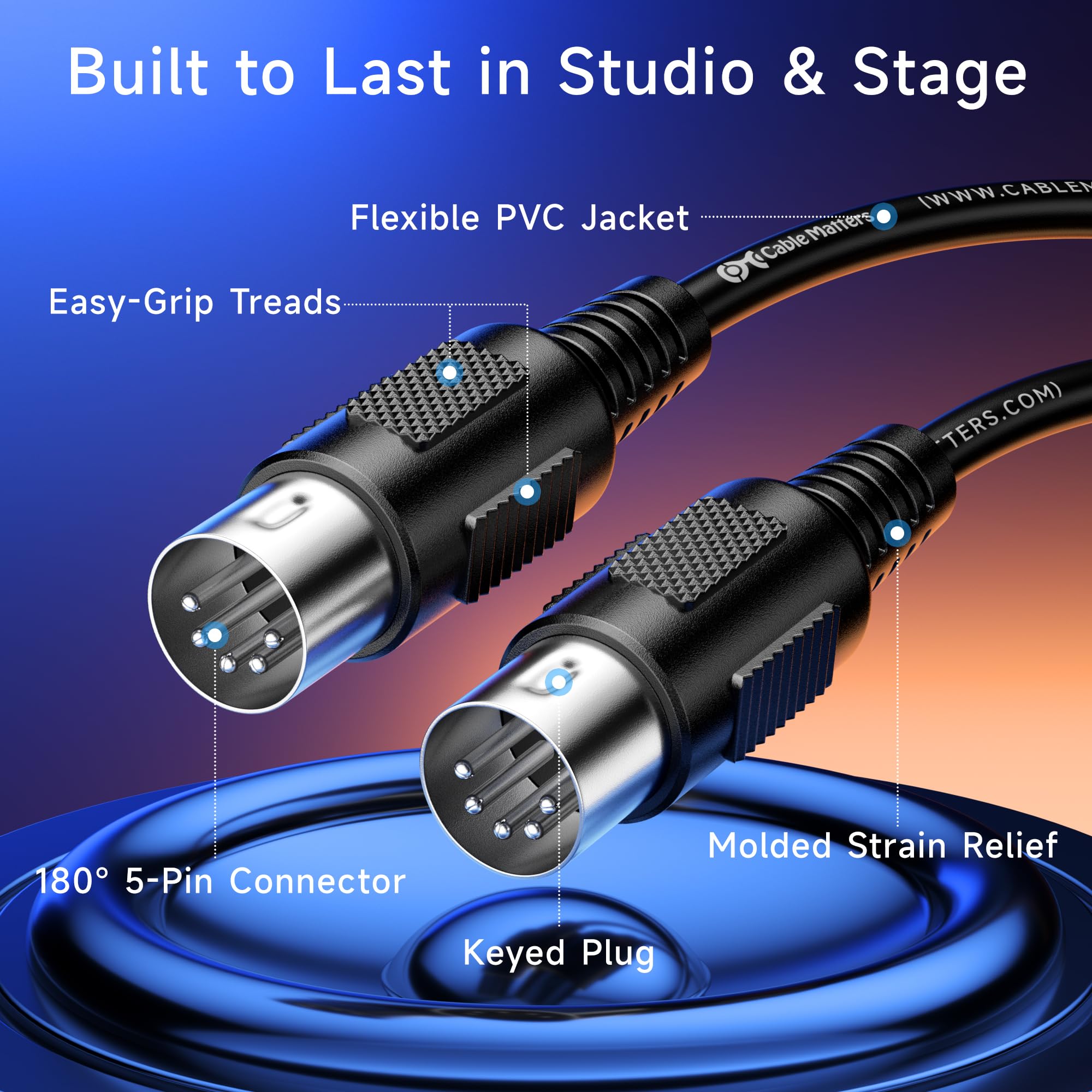 Durable and Flexible Build: These high quality MIDI cables feature a keyed 5 pin DIN connector with easy-grip treads and molded strain relief on each end. The flexible MIDI cord is easy to manage on a desktop or coil for storage with a portable MIDI keyboard.