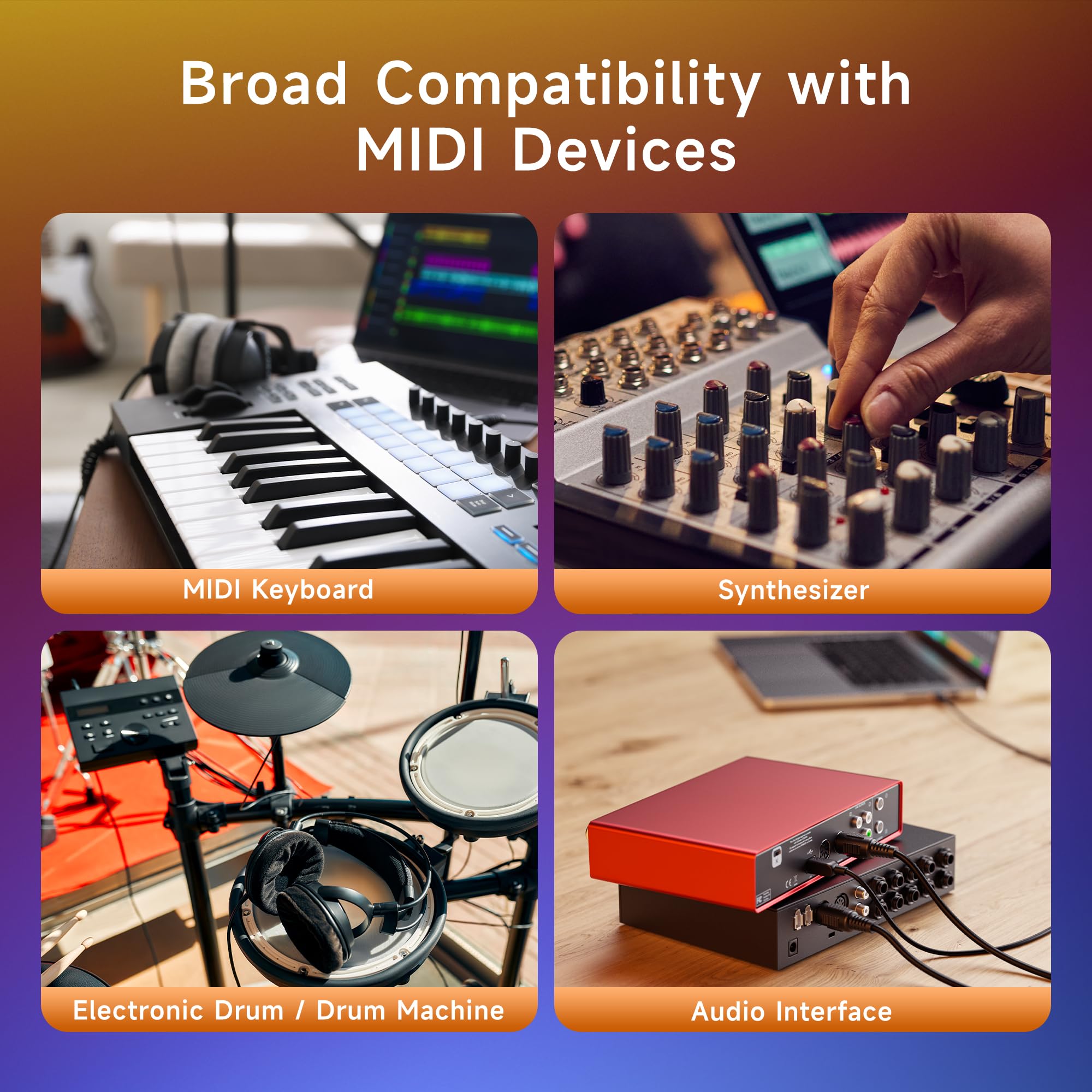 Versatile 5 Pin DIN to 5 Pin DIN Cable: This 5 pin MIDI cable connects a MIDI keyboard controller, MIDI foot controller such as the Behringer FCB1010, MIDI analog synthesizer or MIDI sequencer like the Korg Volca Sample, a MIDI audio interface box such as the Focusrite Scarlett 18i8, electronic drum machines, and more. A reliable MIDI cord for both studio and live performance setups.