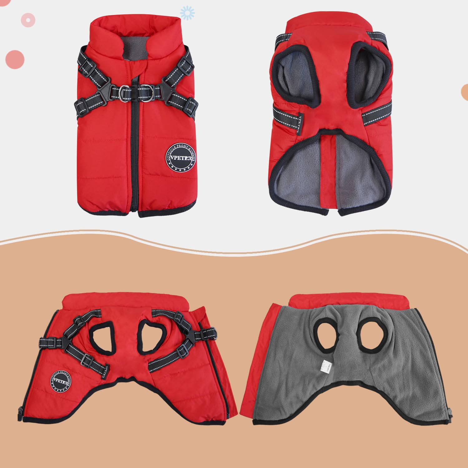 【BUILT IN CROSS-OVER HARNESS】Winter dog coat and dog harness 2 in 4 design,no need extra dog vest harness.Cross design reduces stress,strengthened seams and sturdy D-ring can withstand strong pulling force from your puppy, make everyday walks more enjoyable!All you need is putting on small dog coat, a quick clip and go!In addition, safety reflective strips on the harness,provide extra visibility during night,making your dog easily noticeable to motorists and pedestrians.