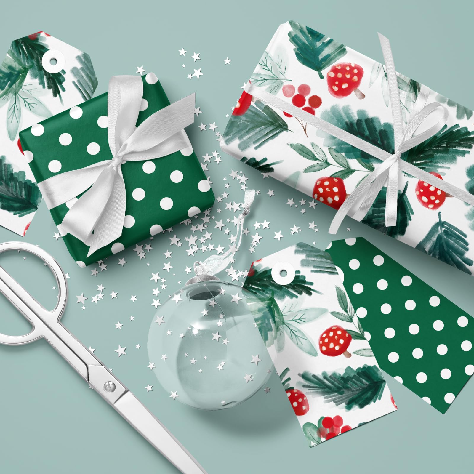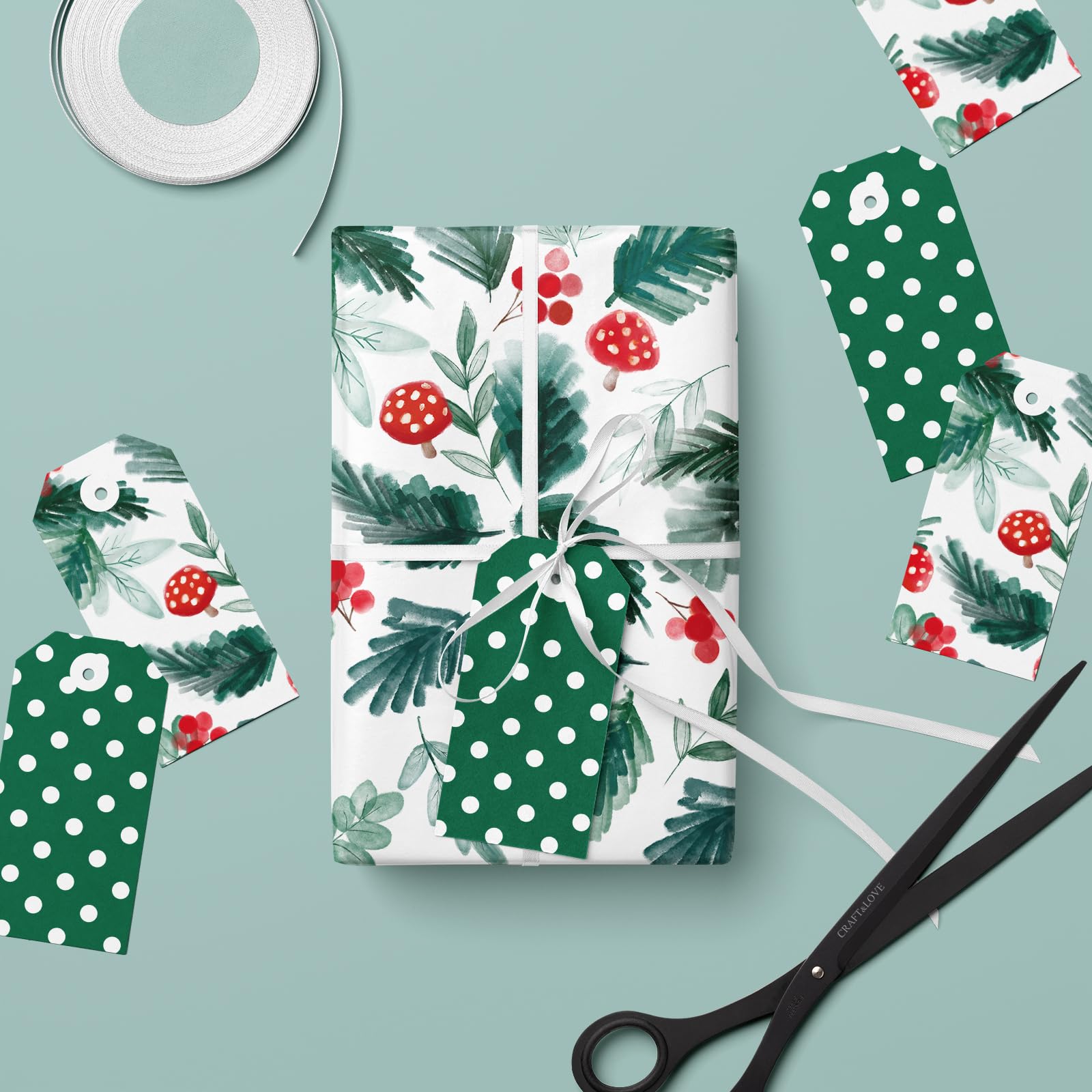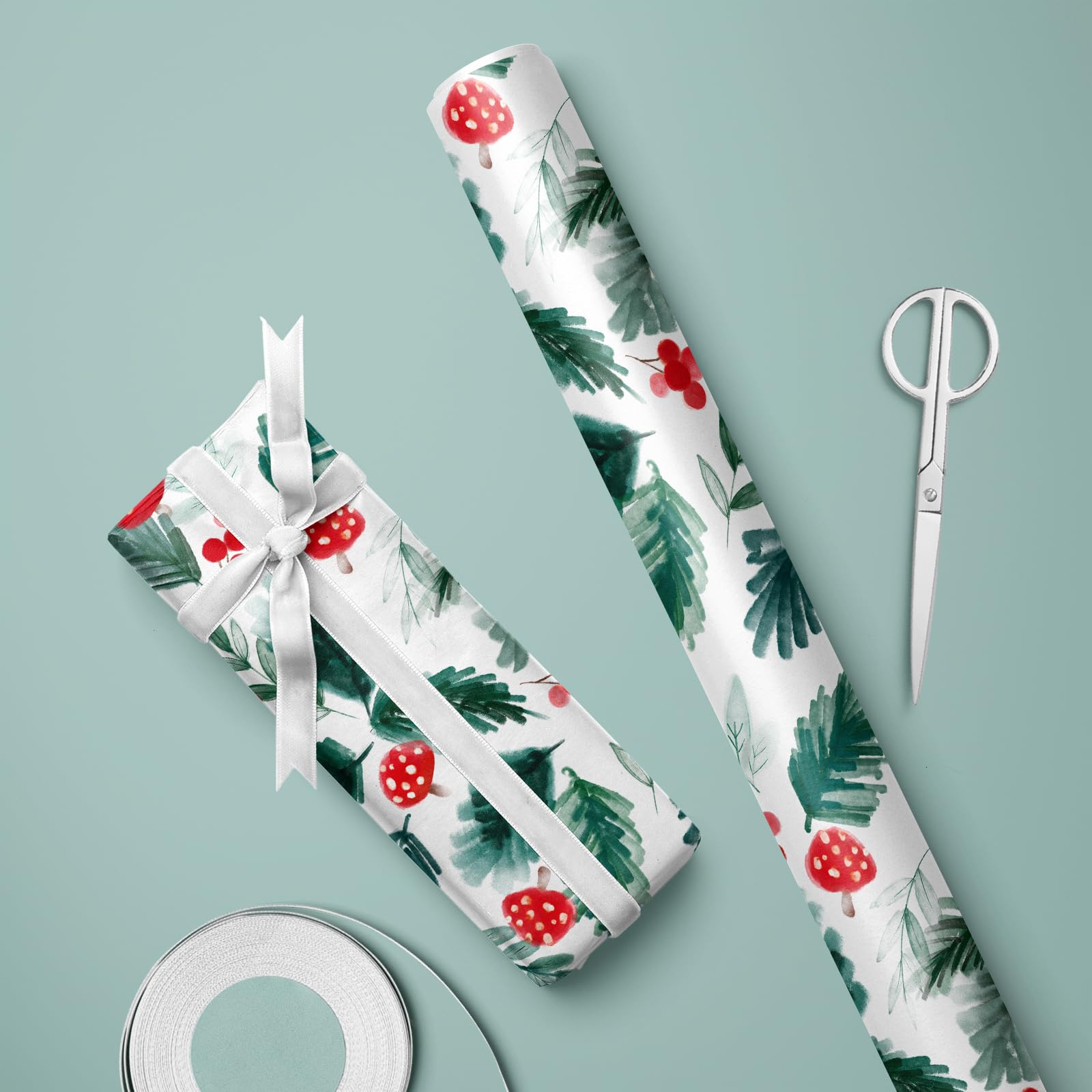 Add a natural and joyful touch to your Christmas gifts with this double-sided wrapping paper roll. One side features a whimsical watercolor pattern of red mushrooms, evergreen leaves, and holiday berries, while the reverse side showcases a classic green-and-white polka dot design for stylish variety. At 17 inches wide and 32.8 feet long, this roll gives you more than 46 square feet of wrapping space—enough to handle a full stack of holiday presents. Made from high-quality coated paper, it’s easy to cut, fold, and tape without ripping. Whether you're preparing for a family Christmas, a festive party, or crafting DIY decorations, this elegant yet playful gift wrap brings festive cheer to every corner.