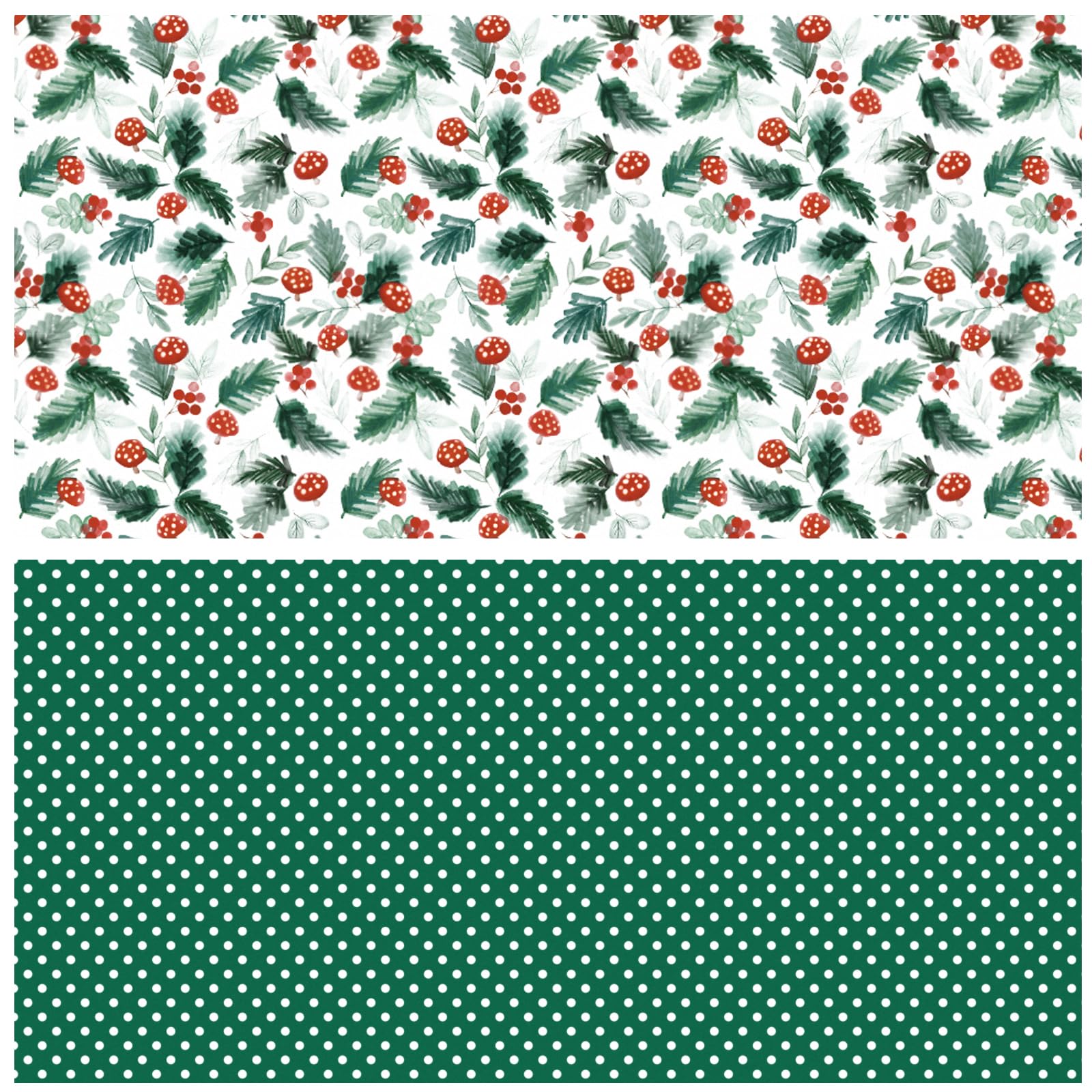 Double-Sided Holiday Design: Features a watercolor-style pattern of festive mushrooms, holly leaves, and berries on one side, with a playful green polka dot print on the reverse.