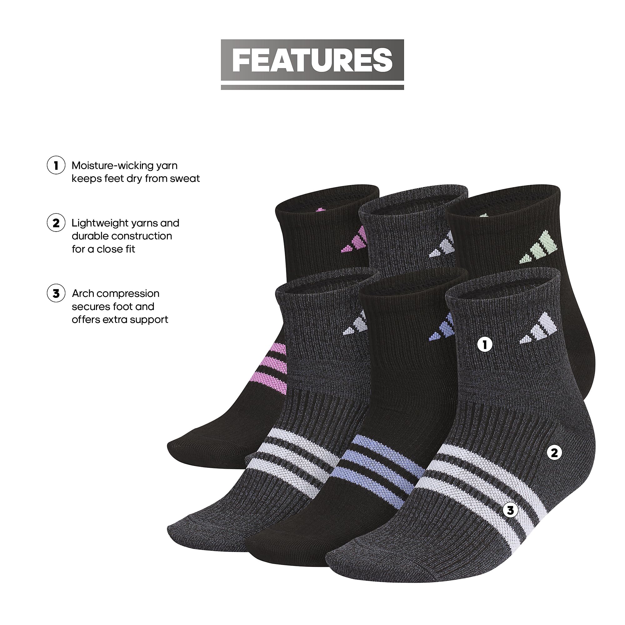 Description Your feet are your foundation. Treat them right with these super-light women's adidas socks. Lightweight and long-lasting, they hug your feet with a secure fit and supportive arch compression, making them suitable for various activities and great as tennis socks women and golf socks for women. Don't worry about breaking a sweat. These women's athletic socks feature moisture-wicking yarn and can be used as womens work socks. Whether you're looking for womens quarter socks or sport socks for women, these socks provide arch support compression and moisture wicking for your feet.