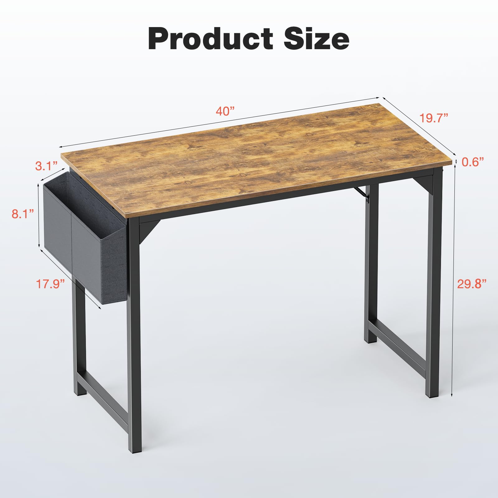 This modern simple design office table is suitable for various scenarios. It adopts a chipboard desktop and metal bracket, which is scratch resistant, waterproof, and sturdy and durable. The desku is equipped with storage bags and hooks, which can help organize clutter and facilitate office and home use. Especially suitable for children's games and learning, it can also serve as a writing desk. Moderate size, suitable for use in small spaces, can help keep the desktop tidy. It is a fully functional computer desk. Related Data Material: Particleboard, Metal Frame Size: 19.69"D x 40"W x 29.80"H Weight: 22.48 lb Maximum load-bearing capacity: 176 lb Product Includes 1 × Home Office desk 1 × Assembly tools 1 × Instruction manual