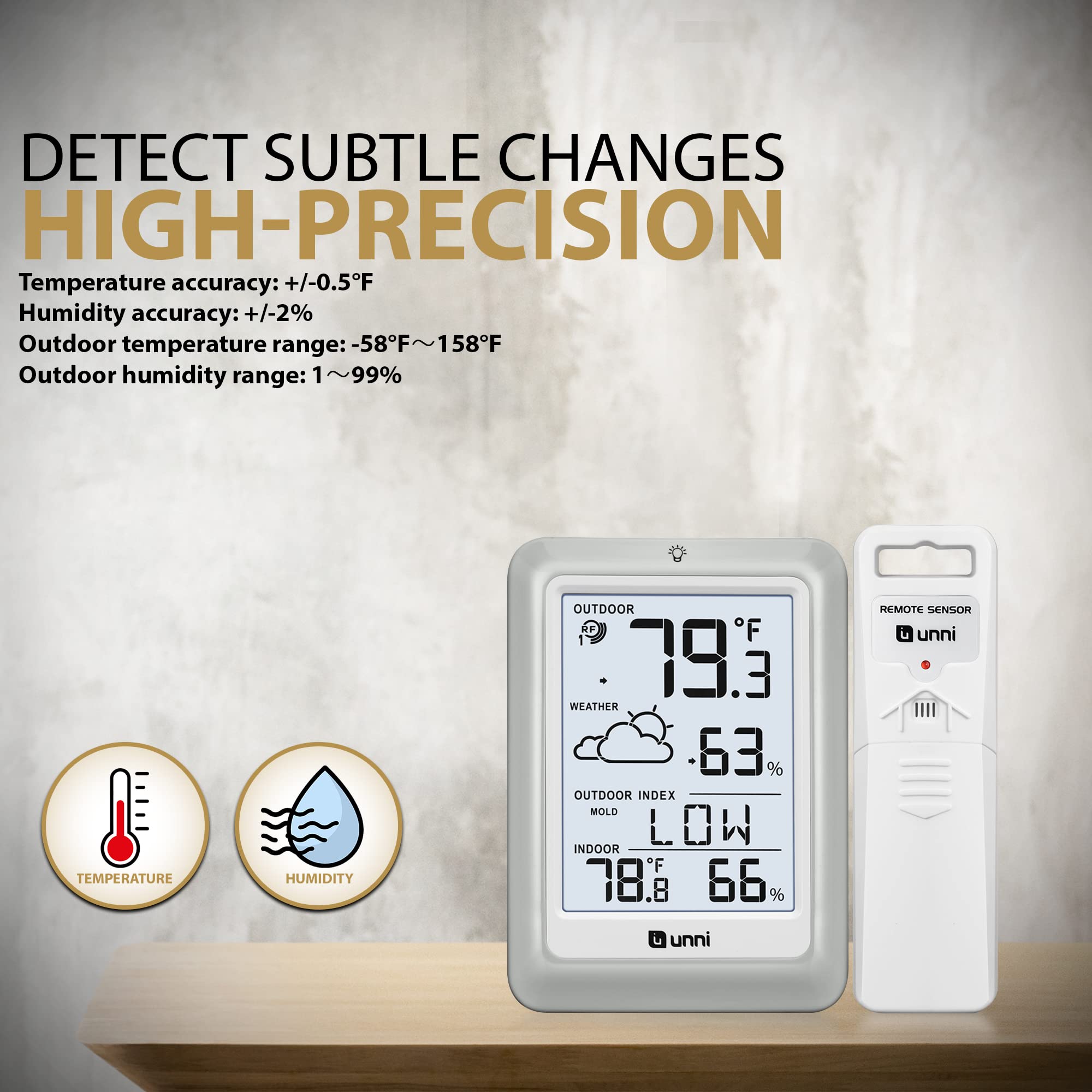 [Air Thermometer and Hygrometer] Our air thermometer and hygrometer feature a Swiss-made high-precision sensirion sensor, ensuring exceptional accuracy. The indoor temperature range is +14.2ºF to +122ºF, while the outdoor temperature range is -58º F to +158ºF, and indoor/outdoor humidity range from 1% to 99%. Temperature accuracy is +/-0.5ºF, and humidity accuracy is +/-2%