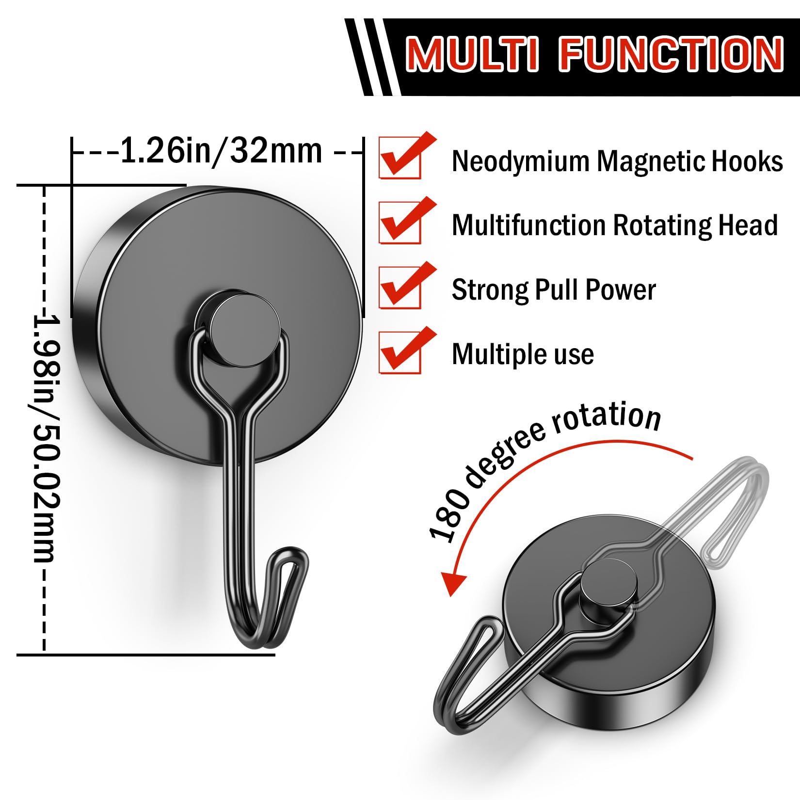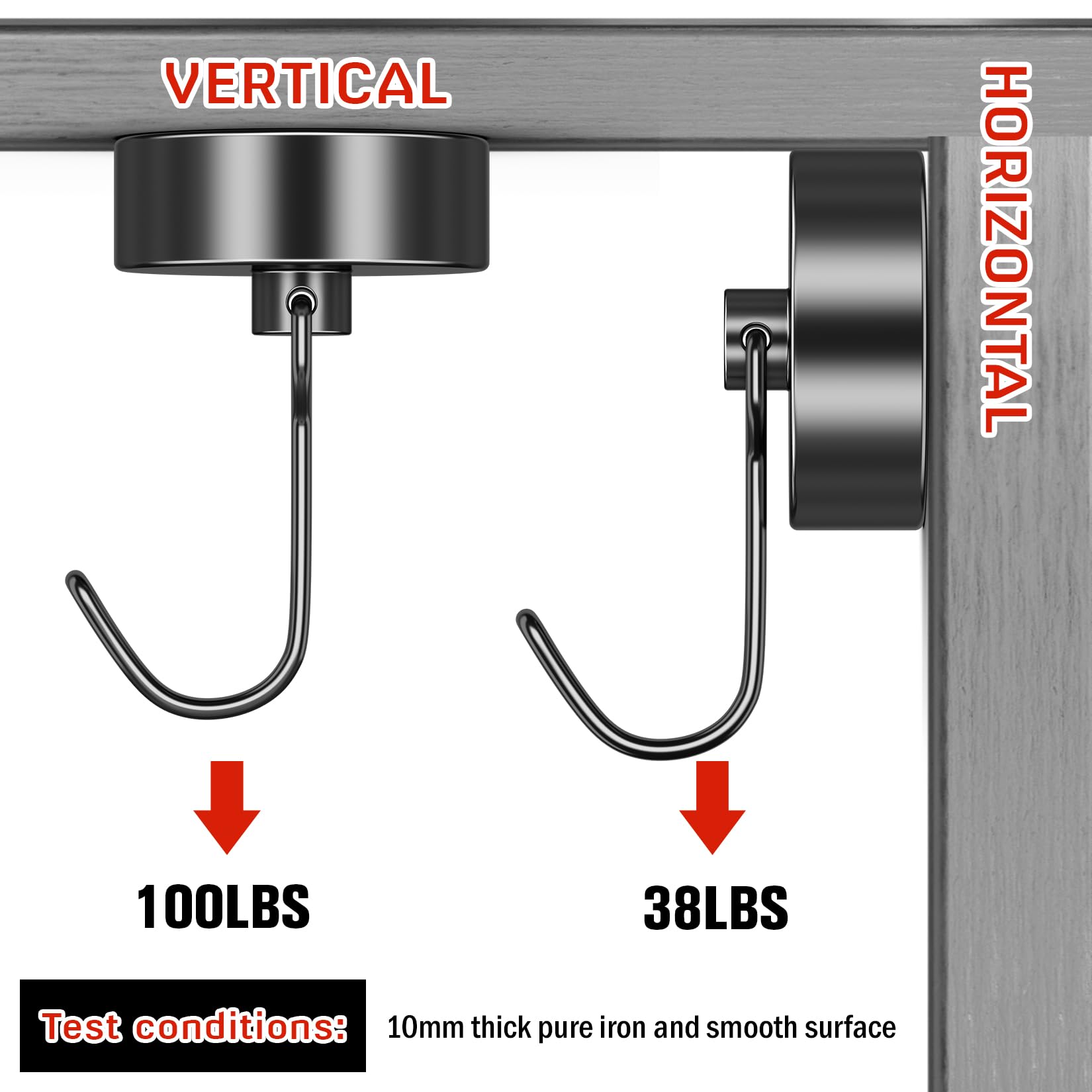 Strong Magnetic Pull: Each Swivel Swing Magnetic hook delivers up to 100lbs+ of vertical holding force under ideal conditions. Please note: when used horizontally, the magnetic strength may decrease by approximately two-thirds. For best results, attach to flat, smooth, and clean metal surfaces to ensure maximum grip.