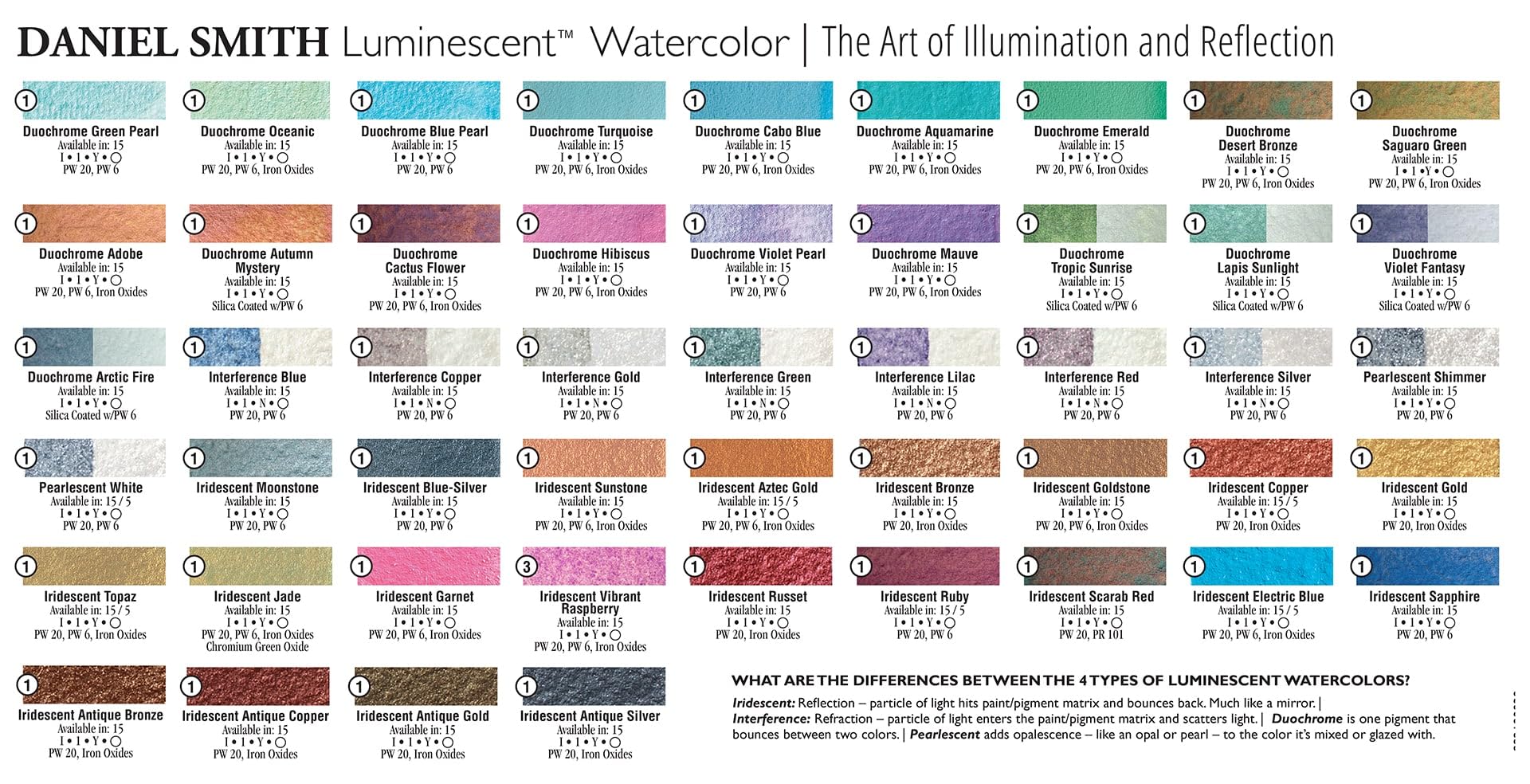 DANIEL SMITH Extra Fine Watercolors - classic watercolors of unsurpassed purity and permanence. The vision in the formulation of DANIEL SMITH watercolors was twofold; First and foremost, to produce watercolors that are the best in lightfastness and permanence. Second, to offer a selection of truly unique colors. DANIEL SMITH Watercolors are formulated to meet and exceed the highest industry standards for the manufacture of artist’s paints, and every batch made is tested and analyzed for its performance qualities. DANIEL SMITH is truly the worldwide leader of watercolors for artists with 240+ beautiful colors in the 15ml watercolors, the most of any manufacturer. Many are traditional colors relied upon by all artists, and there are many “truly unique” colors made only by DANIEL SMITH that have become so important to watercolor artists. PrimaTek Watercolors are made from minerals, often semi precious minerals, that have been ground into pigments, mixed with gum arabic (the binder) and milled into PrimaTek Watercolors. The first was Lapis Lazuli Genuine in 1998, since then, many more have been added such as Amethyst Genuine, Piemontite Genuine and Serpentine Genuine. Most of these colors have wonderful granulating effects that some artists have called “magical”. Luminescent Watercolors have special optical effects perfect for subjects that have a sparkle, sheen, or reflective glow like the iridescence of hummingbird feathers or the sheen of metals. Cadmium Hues, DANIEL SMITH has developed safe and vibrant Cadmium Hues with the density and richness of cadmium colors without the cadmium pigment. Virtually identical in color to their namesakes, they are cleaner in mixtures and much stronger in tints. The working properties – staining power, semi-transparency and excellent lightfastness – are nearly identical to those of the low-soluble cadmium colors DANIEL SMITH previously manufactured. Some unique colors are created exclusively by DANIEL SMITH like Cascade Green, Green Gold and Moonglow. DANIEL SMITH also finds unusual pigments to make colors like Mayan Red, Lunar Blue and Enviro-Friendly Red Iron Oxide to provide more choices for artists. Other colors are from pigments DANIEL SMITH has sourced, often from very specific locations, colors like Burgundy Yellow Ochre, Monte Amiata Natural Sienna and Roasted French Ochre. DANIEL SMITH Watercolors are a favorite of artists all over the world, from professional artists to the beginning watercolorists because of the beautiful colors, consistent performance and lasting color or lightfastness. DANIEL SMITH Watercolors are packed with high quality pigments using pure gum arabic as the binder – no fillers. For each color, DANIEL SMITH selects the perfect grind to yield particle sizes that maximize the qualities inherent in the pigment, balancing maximum pigment load with minimum vehicle content. DANIEL SMITH offers many ways to experience their Watercolors as well as providing extra creative means for artists with their Watercolor Grounds, Masking Fluid and Walnut Ink. 15ml Watercolors, available in more than 240 colors, the most of any manufacturer. 5ml Watercolors, available in 88 of the most popular colors DANIEL SMITH makes. Watercolor Sticks, 51 popular DANIEL SMITH Watercolors shaped into stick form to draw and paint with, a new way to expressively use watercolors. Watercolor Dot Cards, a great way to try DANIEL SMITH Watercolors without buying whole tubes of paint. These are dots of pure DANIEL SMITH Watercolors that reactivate into paint with the touch of a wet brush, allowing artists to easily and cost effectively, try many colors. Two sizes: 238 Dot Card to try nearly the entire line of DANIEL SMITH Watercolors and the 66 Dot Card to try many DANIEL SMITH Watercolors. PrimaTek Watercolors, 37 PrimaTek Watercolors, made from minerals, many semi-precious, that are ground into pigments and made into unique watercolors. Luminescent Watercolors, 48 Luminescent Watercolors with optical effects. Watercolor Sets: Essentials Set, PrimaTek Set, Alvaro Castagnet’s Master Set, Primary and Secondary Sets. Watercolor Ground, Paint watercolors on any surface when prepared with DANIEL SMITH Watercolor Ground, available in 4 colors; Titanium White, Buff Titanium, Mars Black and Transparent. Watercolor Ground can help “rescue” a watercolor painting when applied over a mistake, giving an artist a second chance with a new surface to paint on. When you choose DANIEL SMITH Watercolors and other DANIEL SMITH products, you are choosing the best materials to create with. DANIEL SMITH products are made in the USA, in Seattle, Washington for artists worldwide.