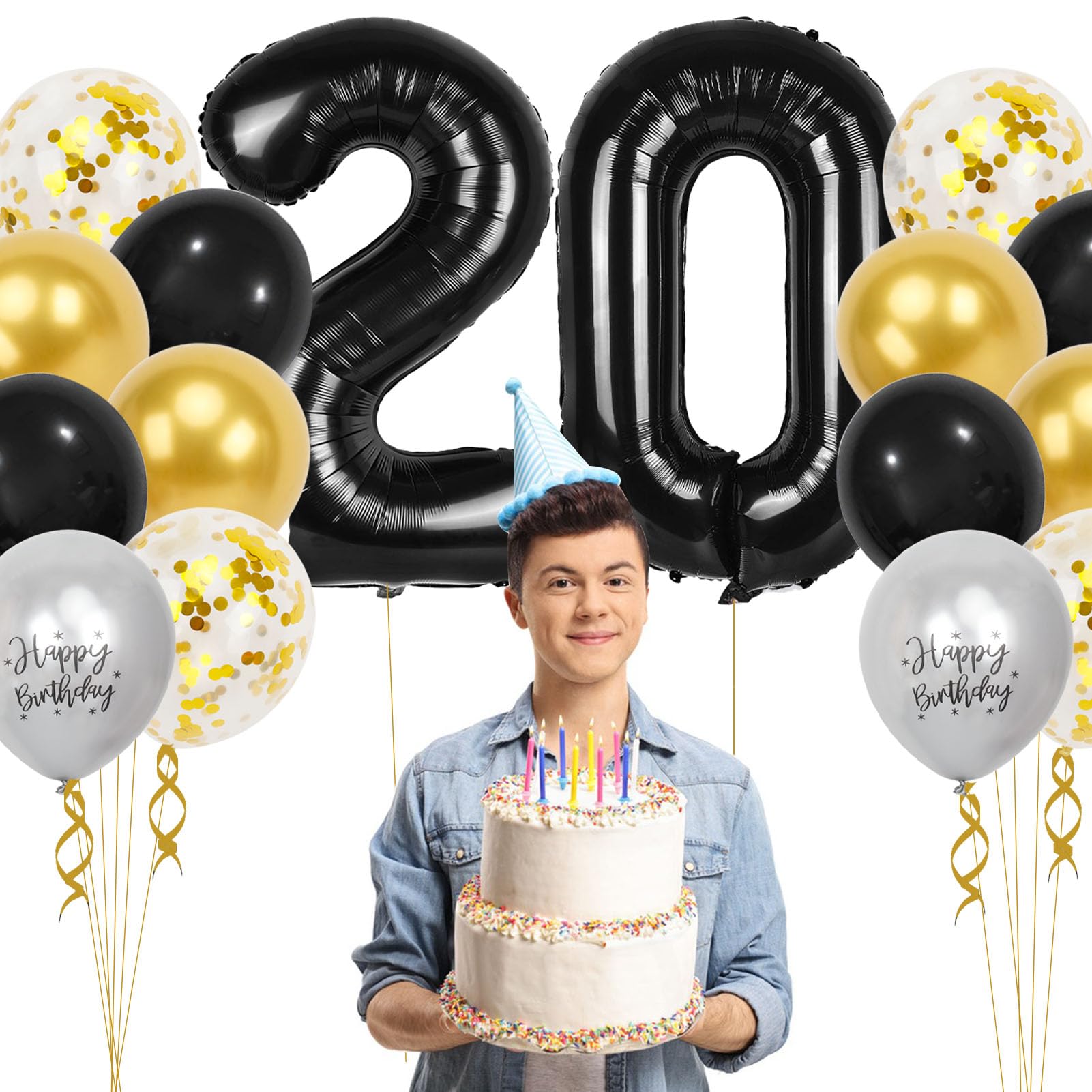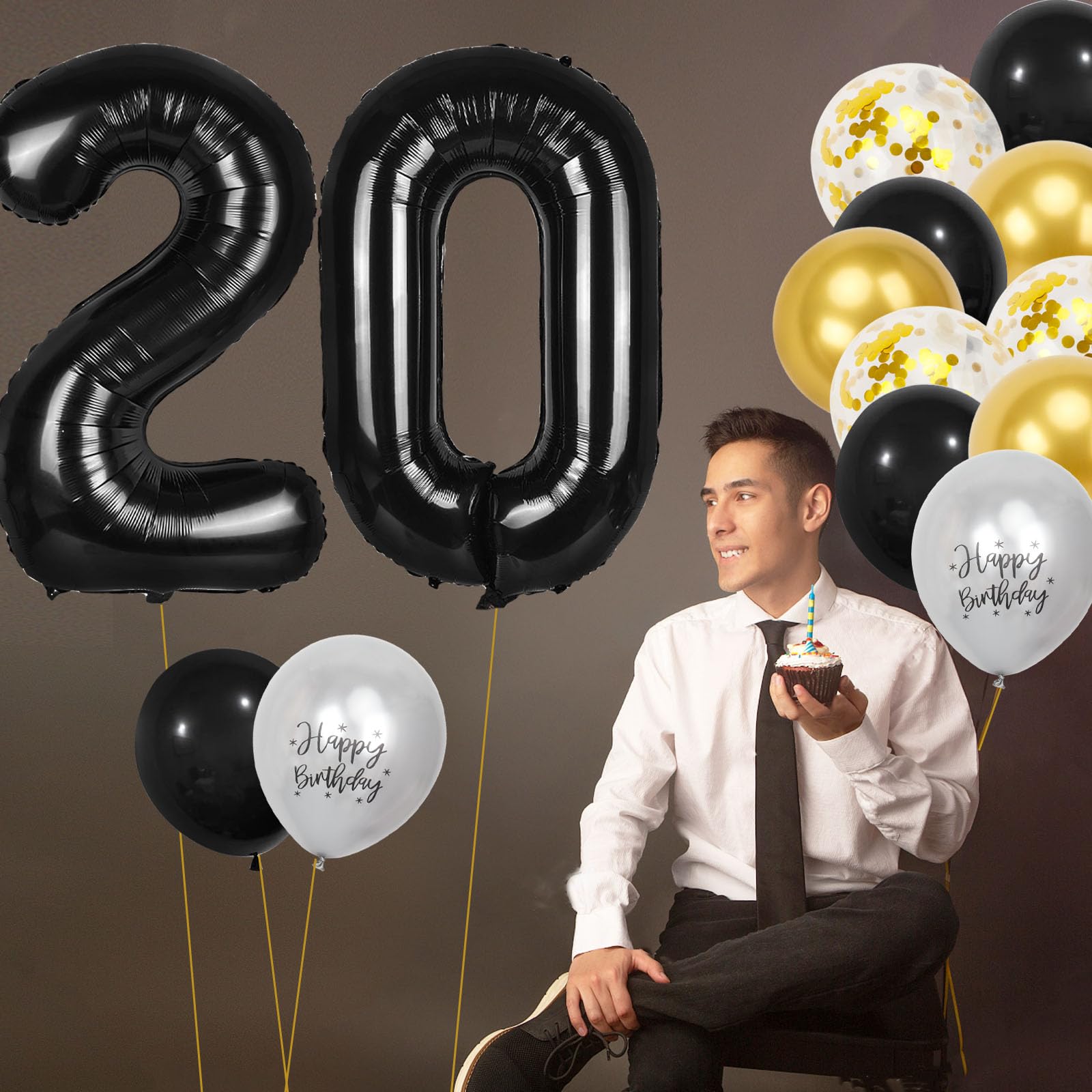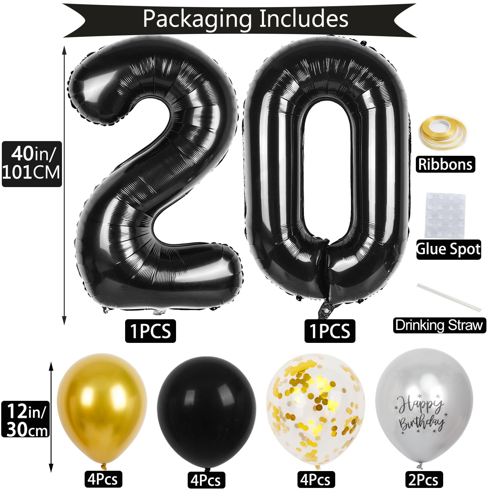 20th Birthday Decorations for Men Set: Package includes 2 pcs large 40 inch black 20 balloon numbers, 4 pcs 12-inch gold metallic balloons, 4 pcs 12-inch gold confetti balloons, 4 pcs 12-inch black latex balloons, 2 pcs 12-inch silver metallic birthday balloons, 1 gold ribbon, 1 piece of straw 1 sheet of glue dots. This 20th birthday decorations for men is perfect for celebrating your 20th birthday or 20th anniversary decorations and makes your party even more exciting!