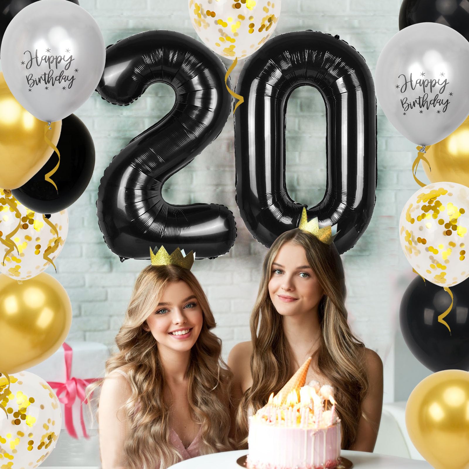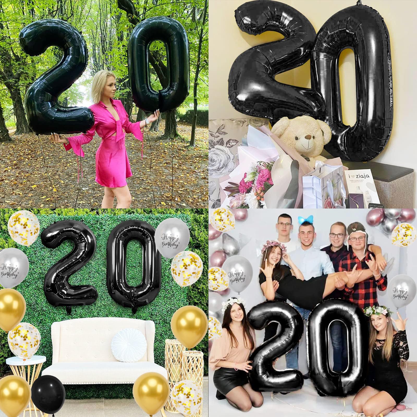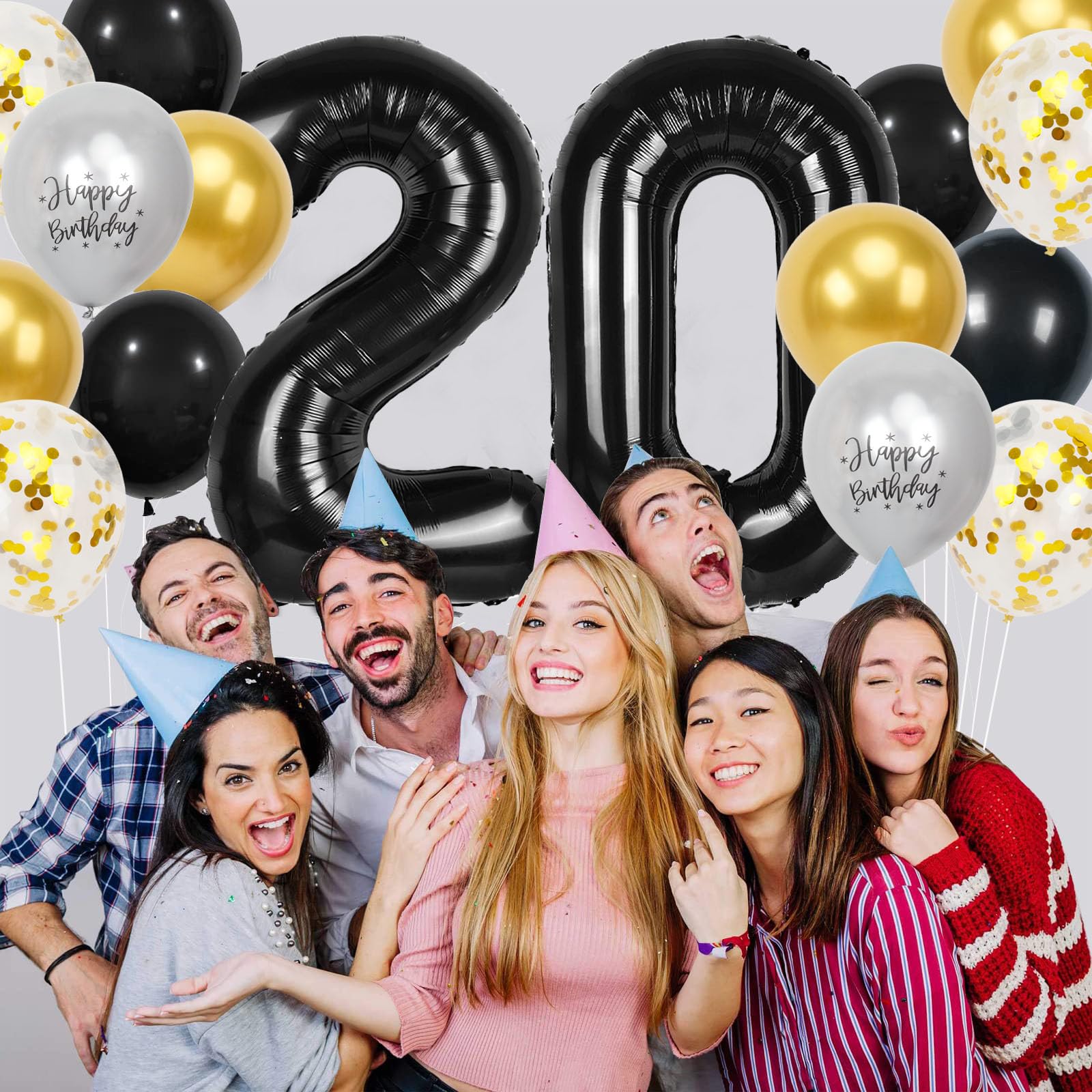 20th Birthday Decorations for Men Set: Package includes 2 pcs large 40 inch black 20 balloon numbers, 4 pcs 12-inch gold metallic balloons, 4 pcs 12-inch gold confetti balloons, 4 pcs 12-inch black latex balloons, 2 pcs 12-inch silver metallic birthday balloons, 1 gold ribbon, 1 piece of straw 1 sheet of glue dots. This 20th birthday decorations for men is perfect for celebrating your 20th birthday or 20th anniversary decorations and makes your party even more exciting!