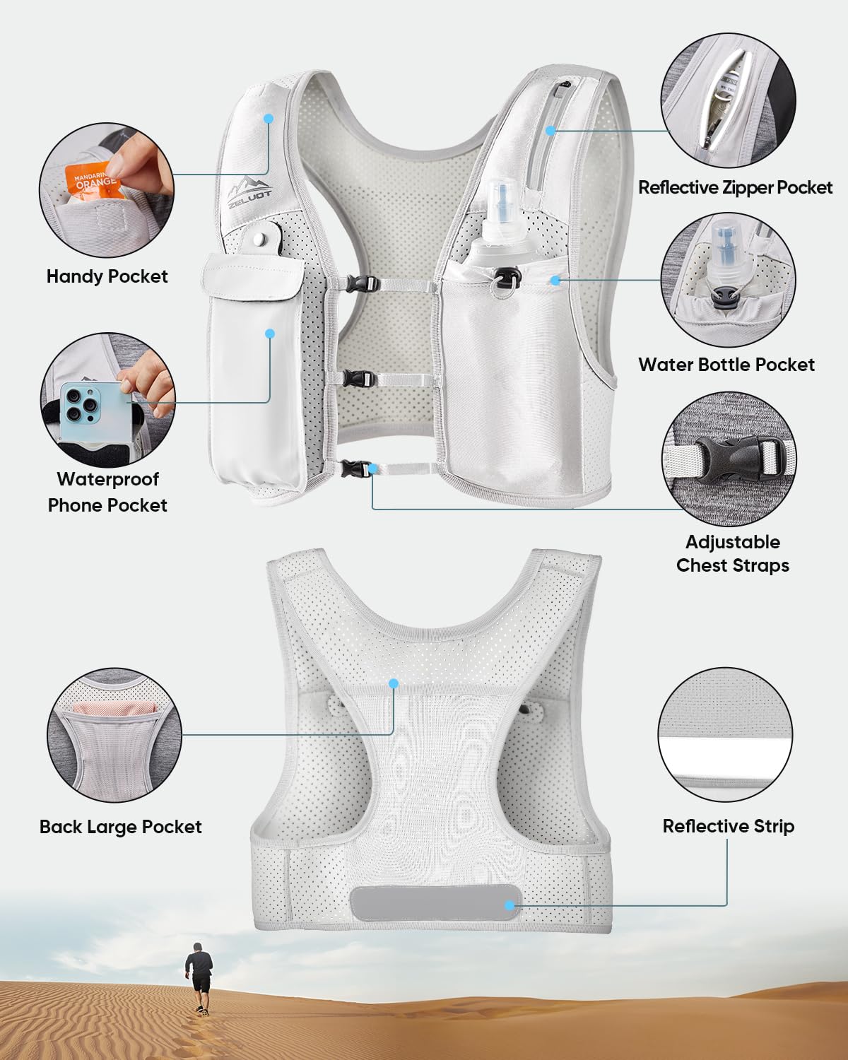 Breathable and Featherlight - Zelvot hydration vest is made from breathable, lightweight neoprene with triple-sized ventilation holes for accelerated air circulation and moisture-wicking. It barely tips the scales at 7.5 ounces, ensuring it won't slow you down. Reflective logo and strip on the front and back increase safety in low-visibility scenarios. This reflective running vest makes every run farther, safer, and more comfortable.