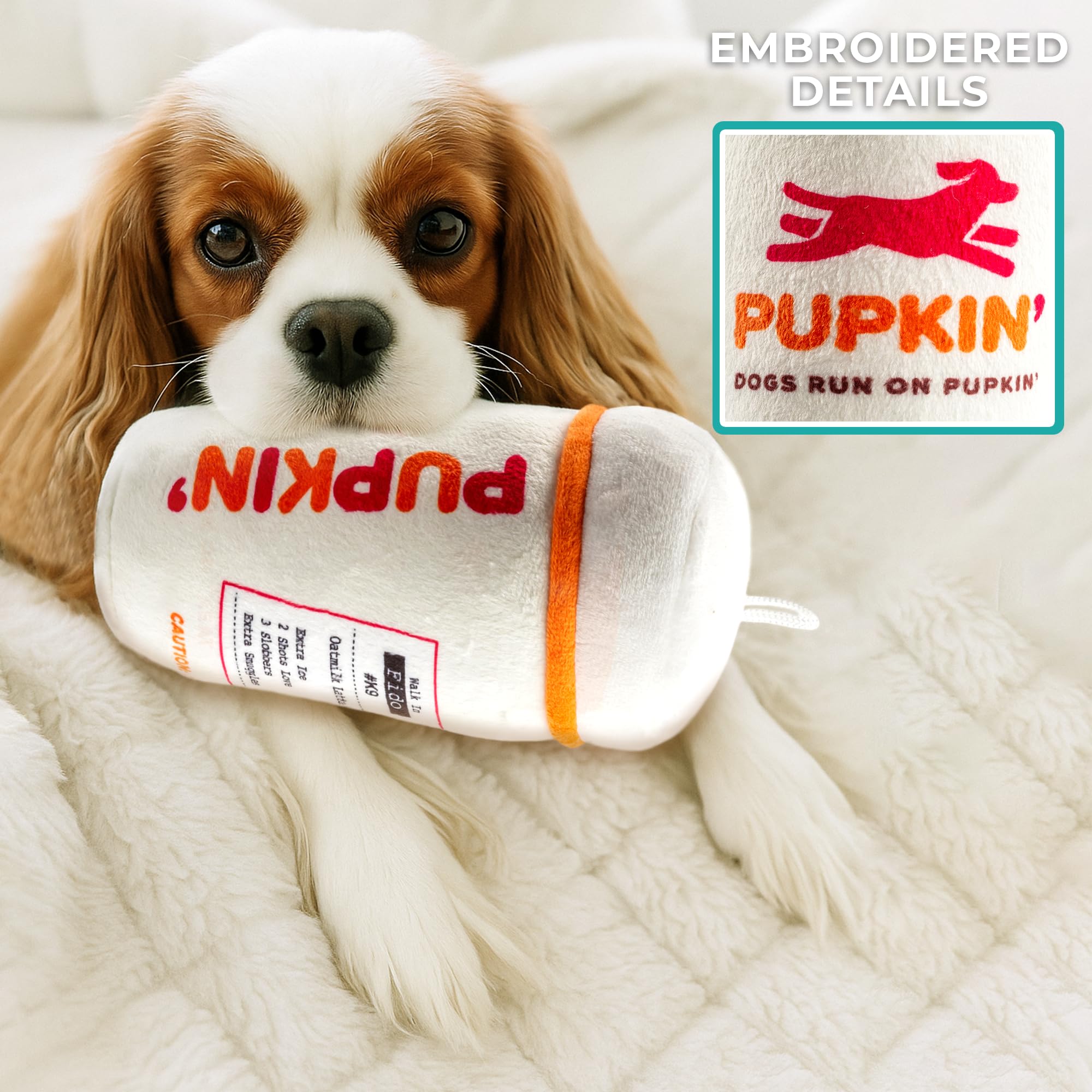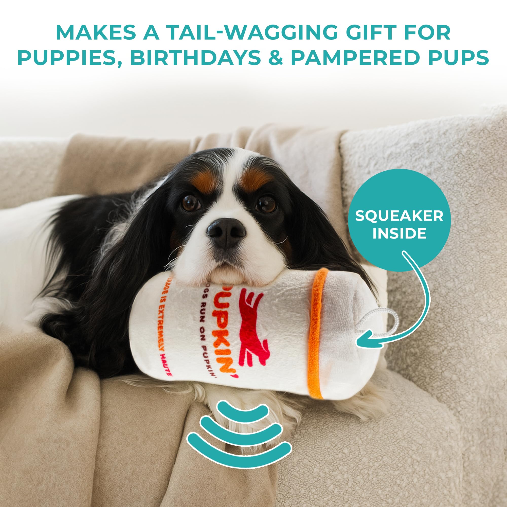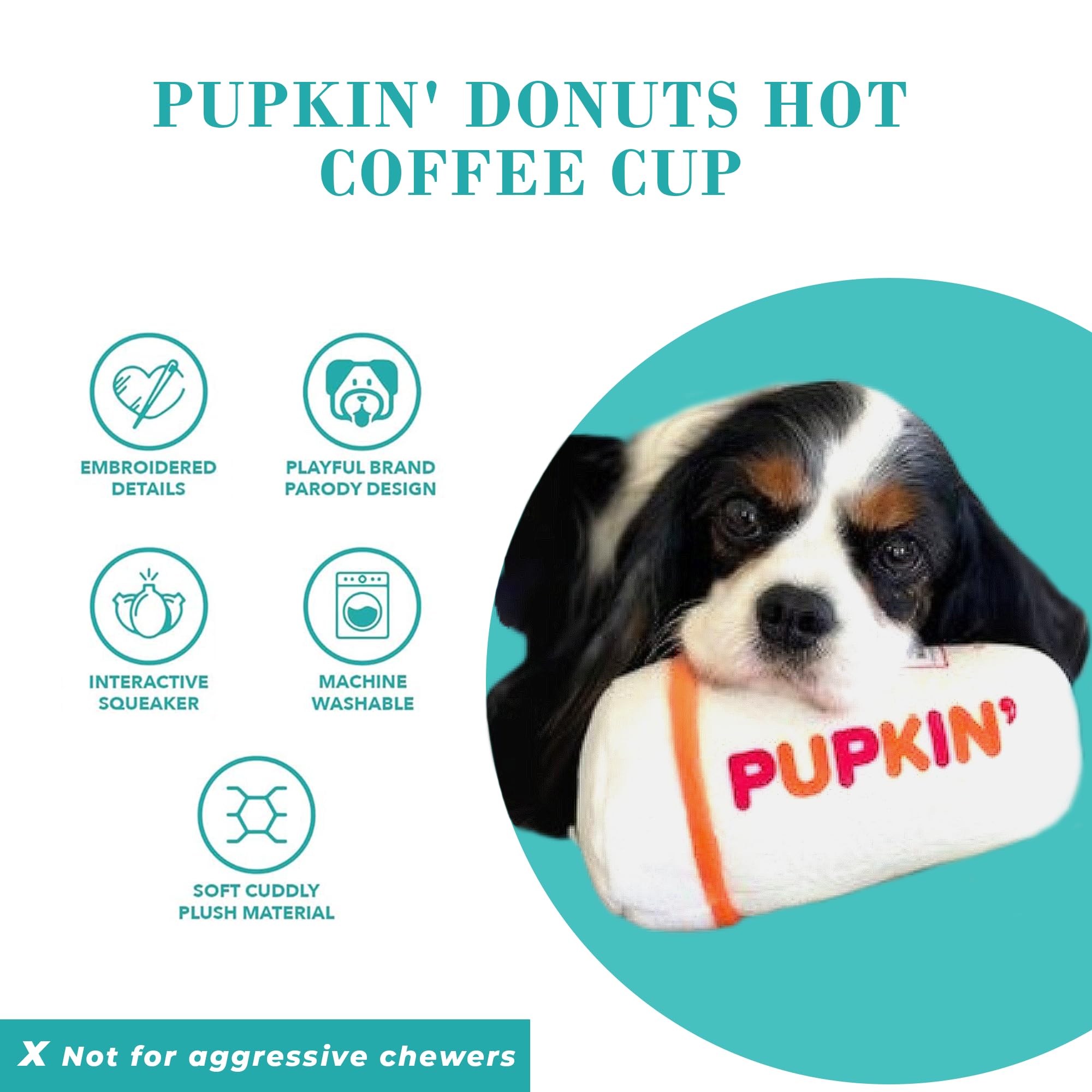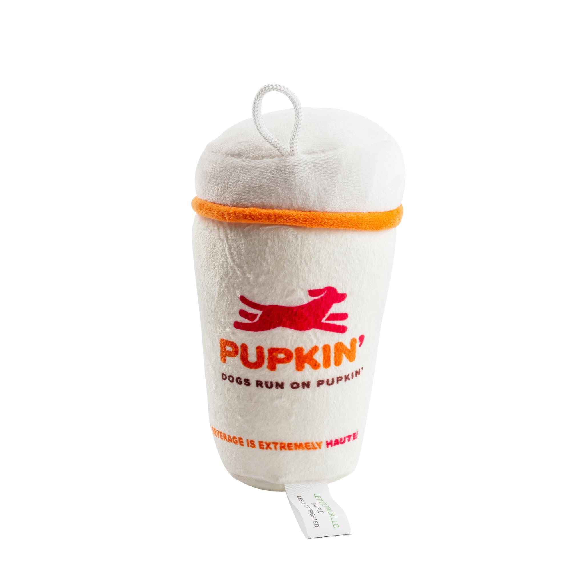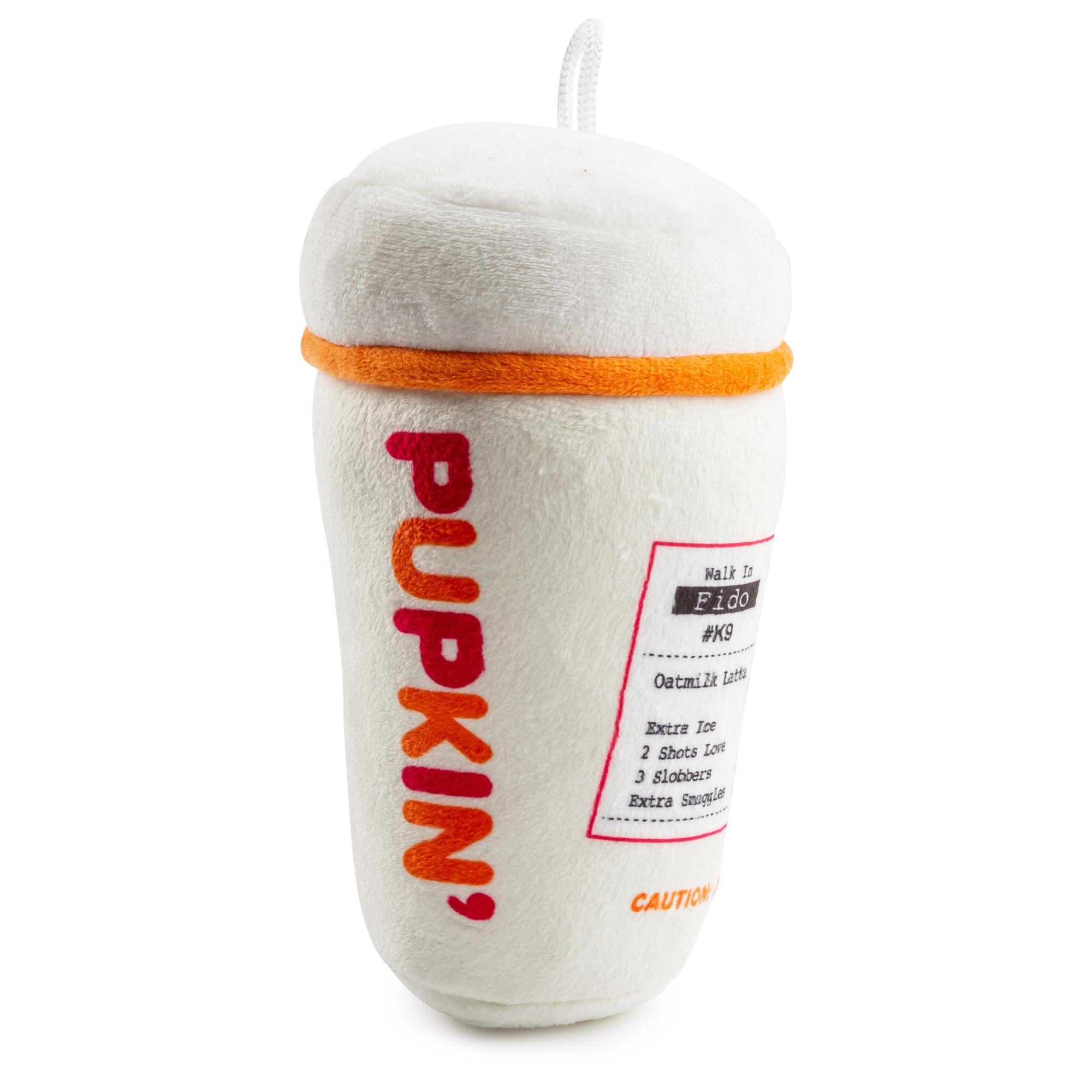 Funny Parody Plush Dog Toy: Perk up your pooch with a cup of canine caffeine with our Pupkin’ Donuts Hot Coffee Cup dog toy. This funny dog toy features a white plush exterior with a built-in squeaker hidden inside. It’s a fun, cute interactive dog toy that will start any morning off right! One size: 7"x3.75"x3"