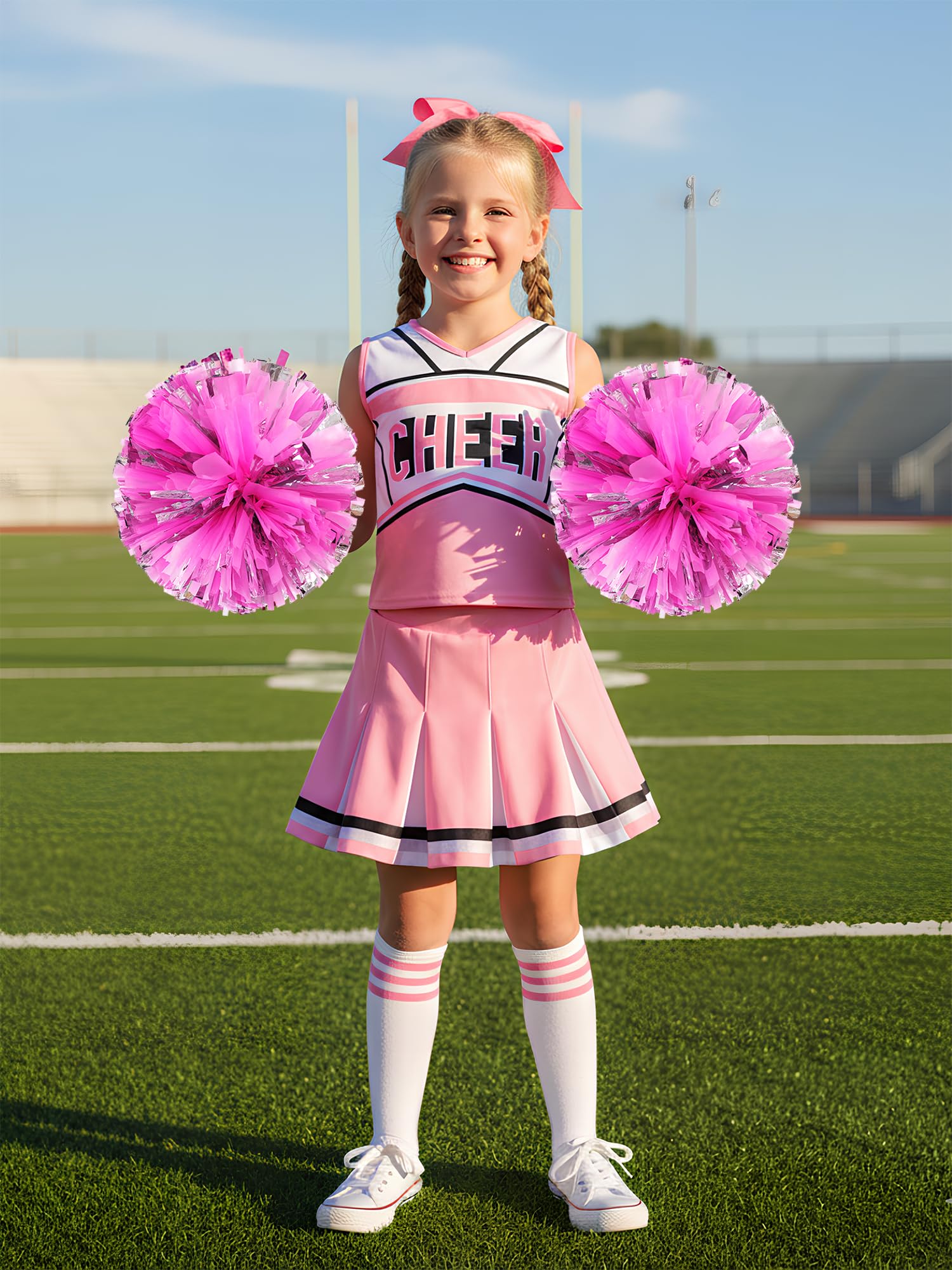 Complete Cheerleader Ensemble Set:Includes all essential items: "CHEER" lettered top, matching skirt, pom poms, hair bow, and knee-high socks for instant team-ready appearance.