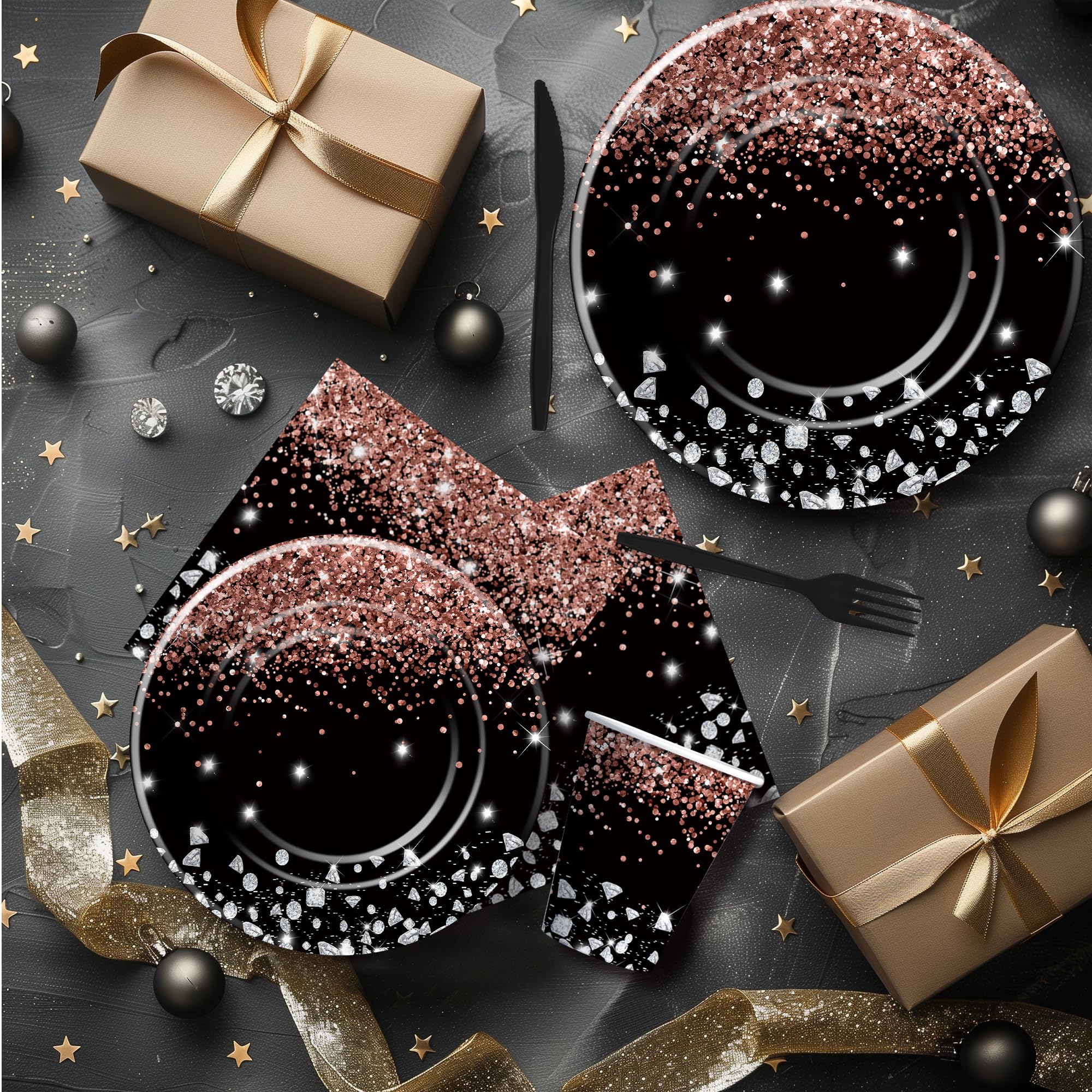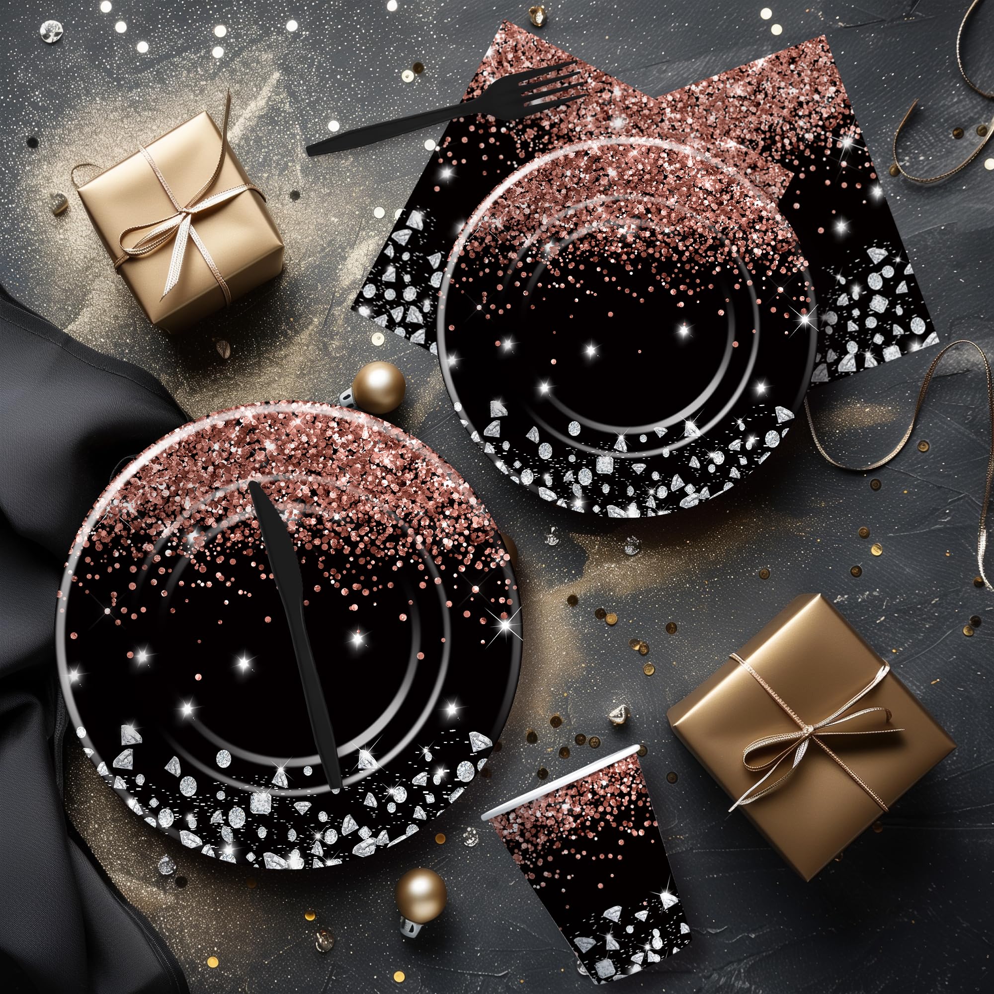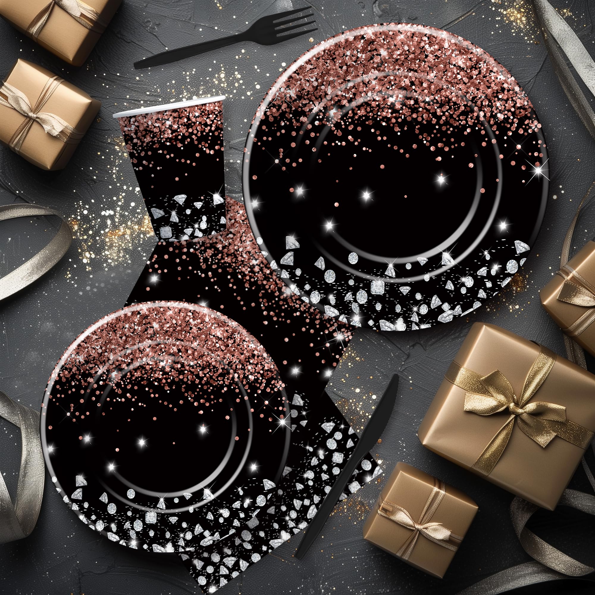 【Black And Rose Gold Birthday Decorations】Our rose gold black plates and napkins party supplies tableware feature a sophisticated and stylish design, combining luxurious rose gold accents with sleek black and diamond elements to create an upscale ambiance for any celebration