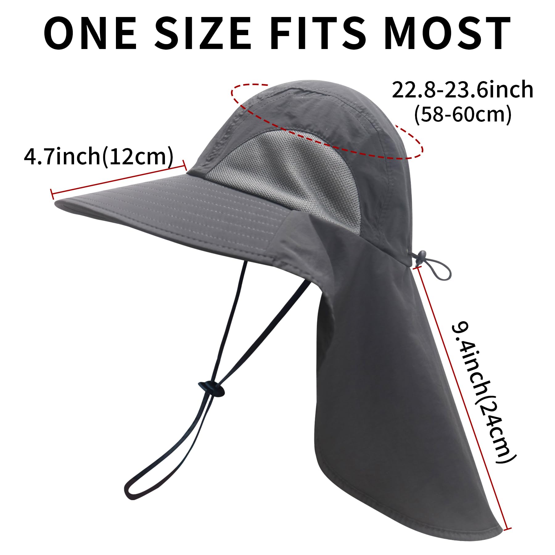 Description SUN PROTECTION: The sun fishing hats are designed with the neck flap and wide brim, which provide excellent protection for your head and neck from UV rays even under strong sunlight LIGHTWEIGHT & FOLDABLE: When you're not using the neck flap, you can easily fold it up and store it. The portable sun hats are great for taking with you wherever you go ADJUSTABLE & WATERPROOF: The quick-drying fishing hats suit most men and women, featuring an adjustable drawstring and chin strap. The sun hats can stay securely in place and withstand light rain COMFORTABLE & BREATHABLE: Wide mesh vent ensures the effective ventilation. The 360-degree sweatband inside the sun fishing hat and the breathable lining can efficiently absorb sweat for your comfort even if you wear the sun hat all day WIDELY USED: The sun fishing hat is a practical outdoor accessory when hiking, gardening, fishing, beach outings, camping or other activities. The fishing hat is also a thoughtful gift for your family and friends