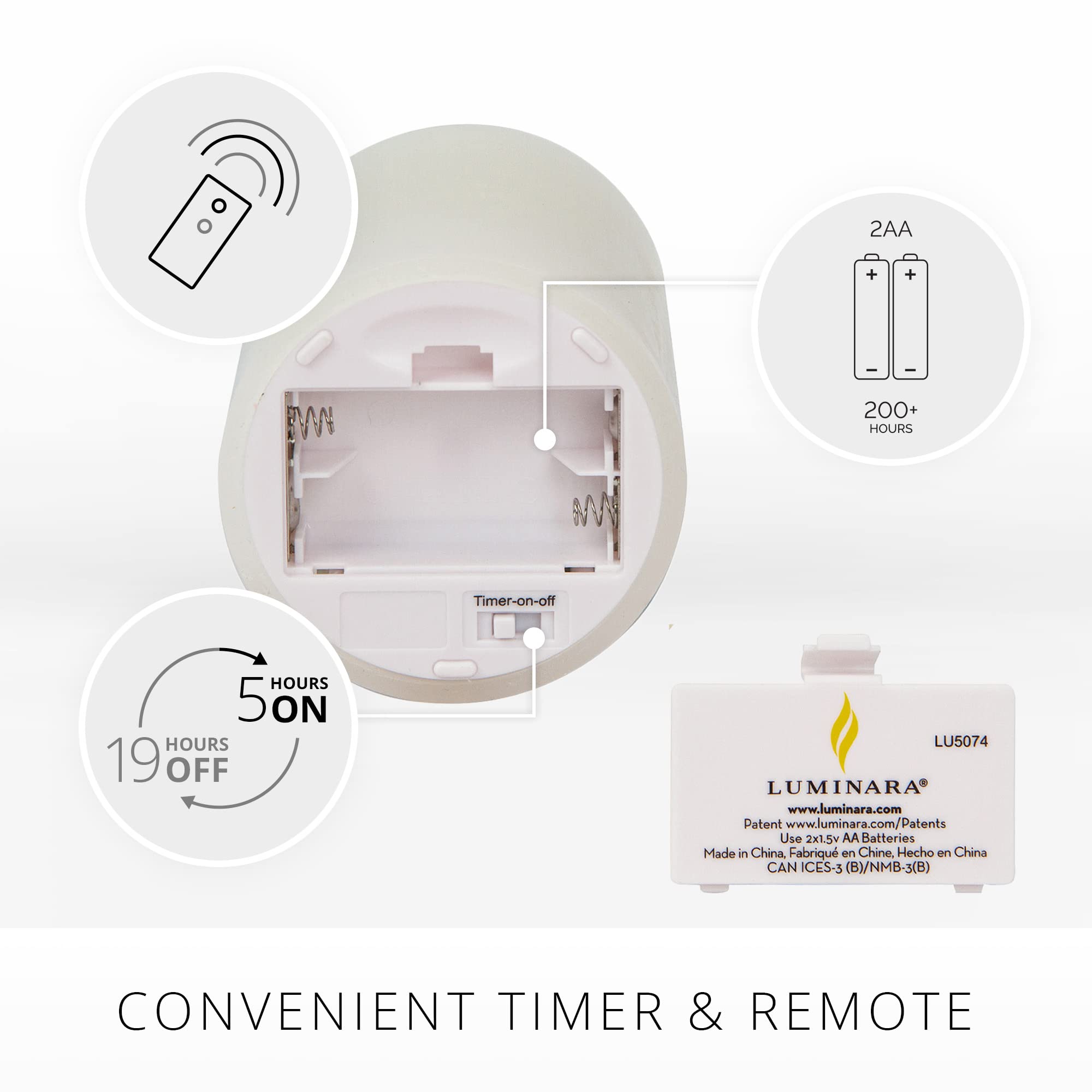 Each candle takes 2 AA Batteries (purchase separately). When using the timer function, the candle will light up for 5 hours, and then automatically shut off for 19 hours. Candles can provide up to 200 hours of runtime before needing to replace the batteries. With proper care, these flameless candles will provide years of lovely, safe illumination. It also comes with a On / OFF Remote Control (1 CR2025 Battey included)