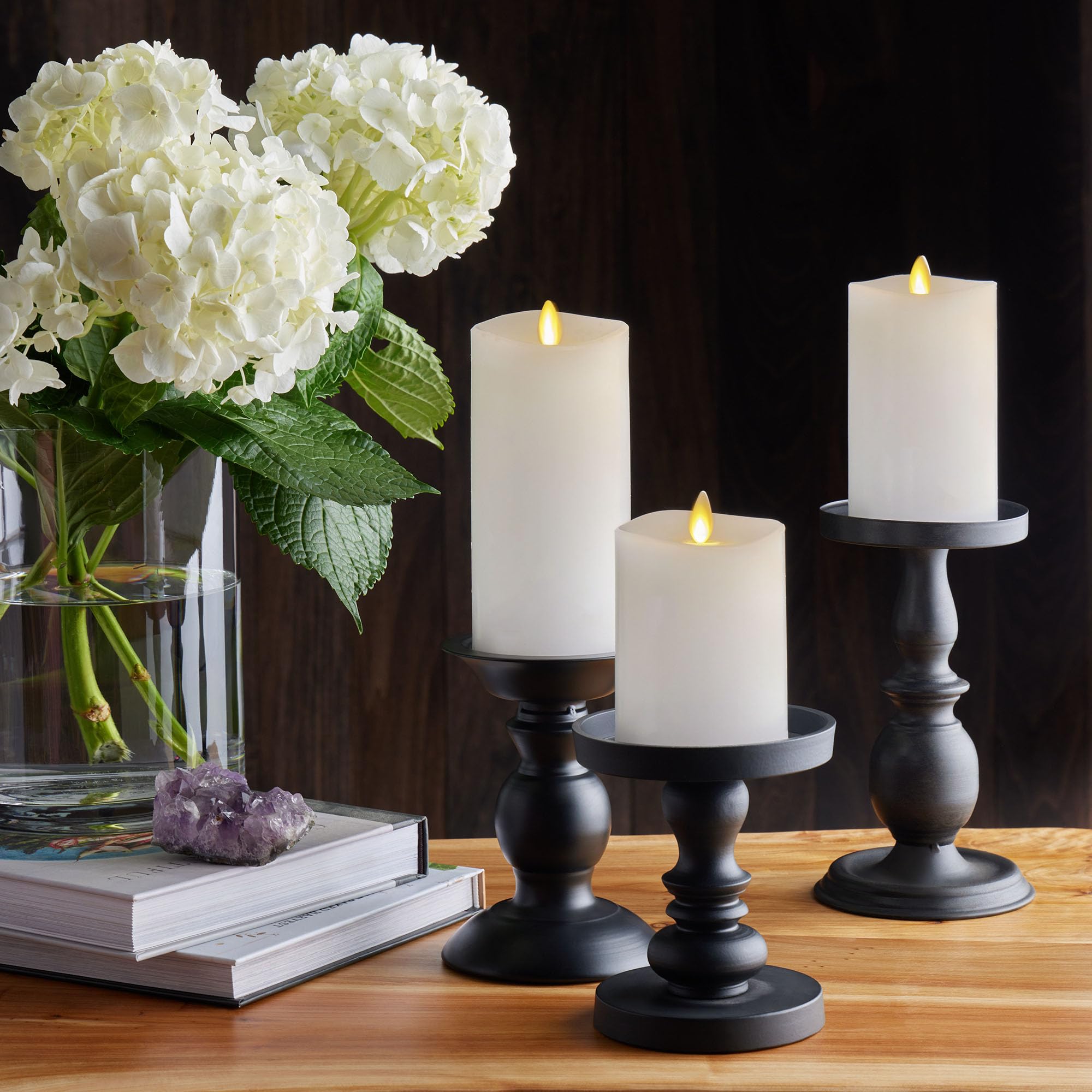 Enjoy the cozy glow of candles without any of the fuss! These three candles are 3" in diameter each, and include a 4.5", 5.5", and 6.5" candle in height. These real flame-effect candles aren't so small they disappear into the background, but not so big they dominate the room. These flameless candles are capable of being operated by a remote, which is included. They also can be turned on and off by a switch on the bottom, which also activates the timer.