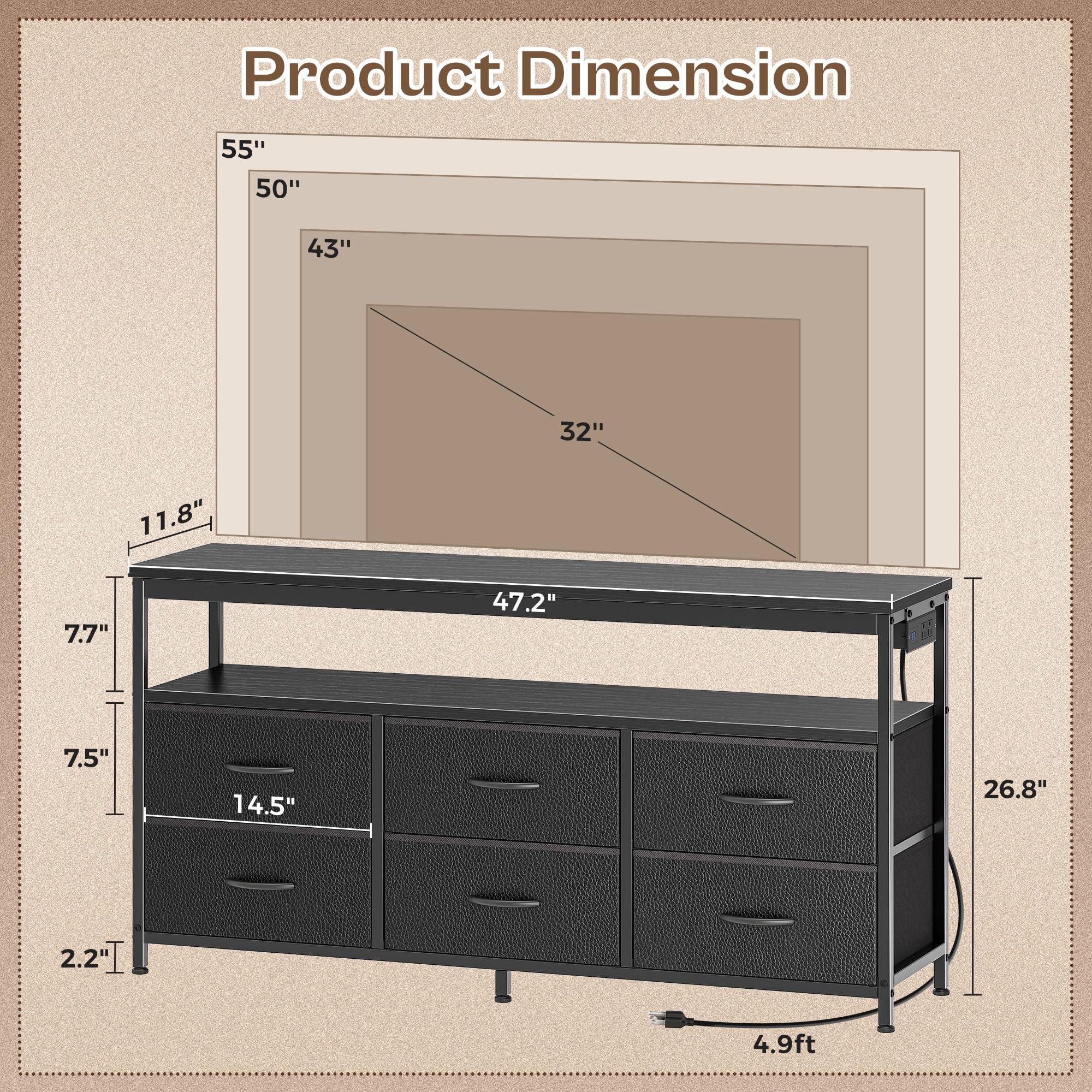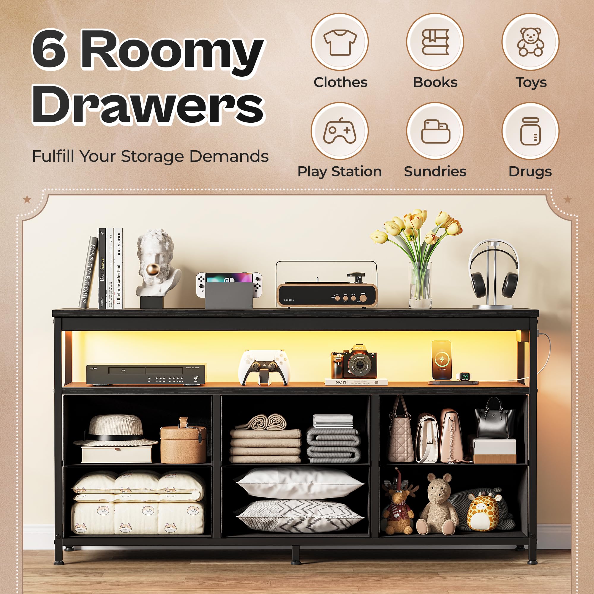 【Spacious 6-Drawer Storage & Support TV up to 55 Inches】With 6 large fabric drawers, this 6 drawer dresser for bedroom is perfect for storing essentials, from clothes and blankets to books and electronics. The open shelf is ideal for showcasing photos, plants, or decorative items, and and spacious desktop can securely support a TV up to 55 inches, creating a tidy, multifunctional space in your home