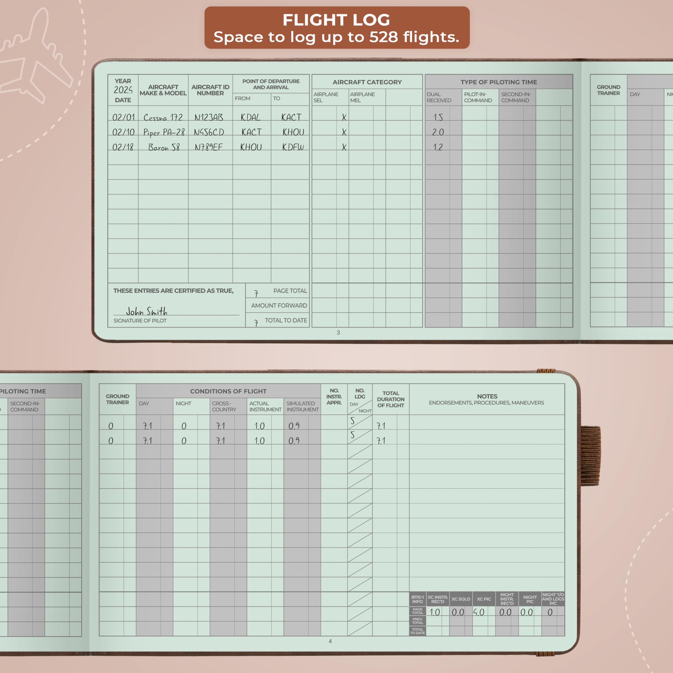 AMPLE SPACE TO DOCUMENT YOUR JOURNEY – With 131 pages, this flight log book for student pilots and professional pilots provides plenty of room to record your progress as you advance in your aviation career.