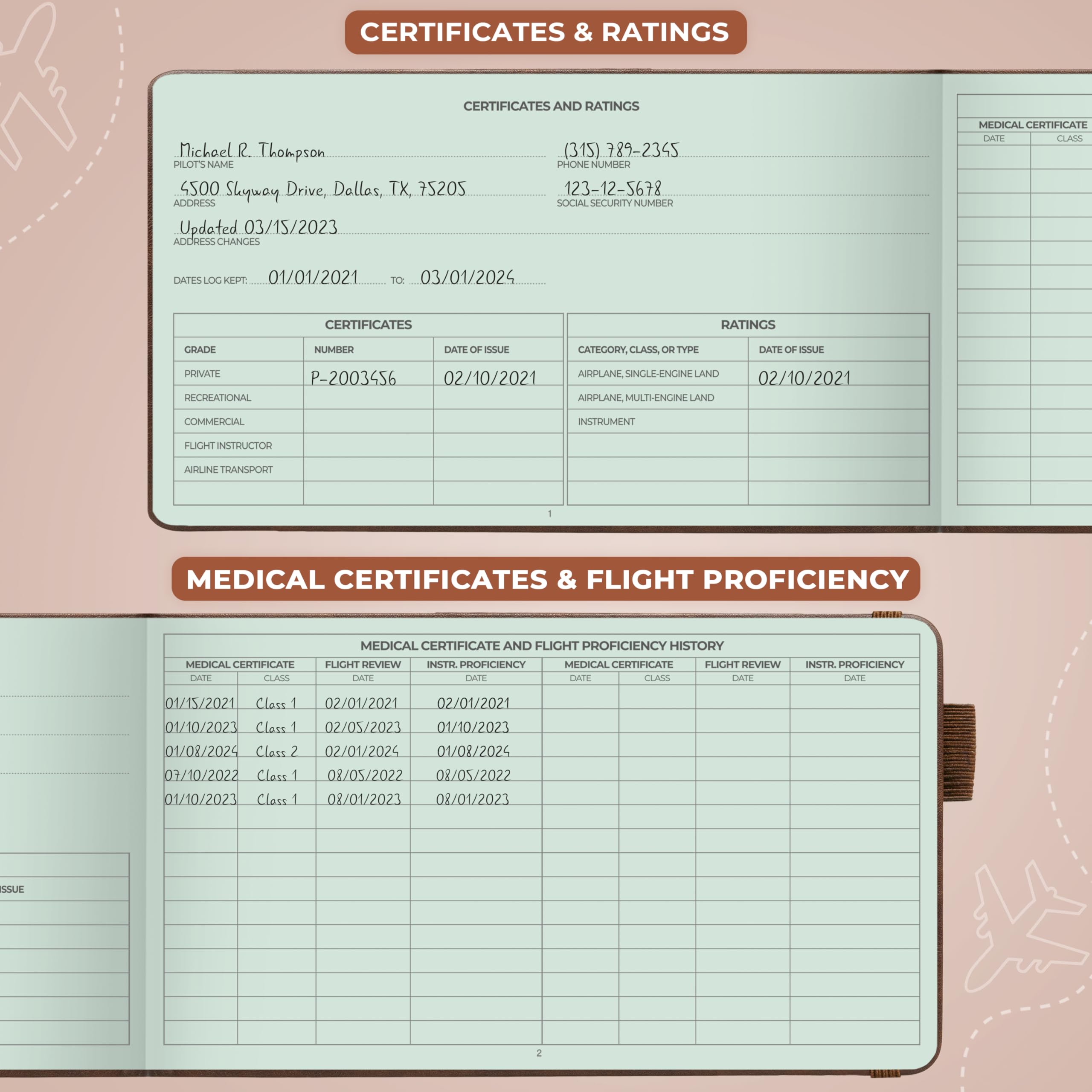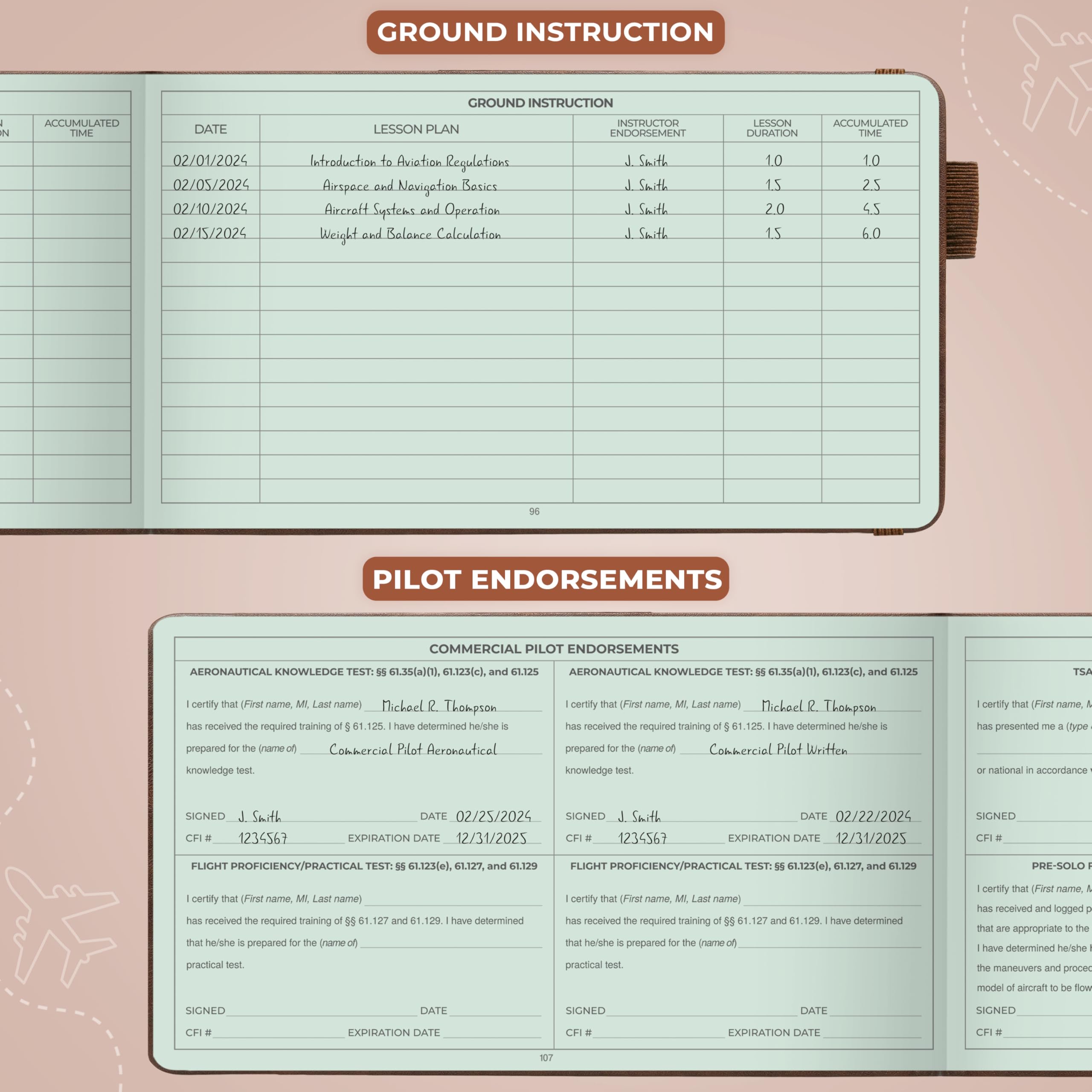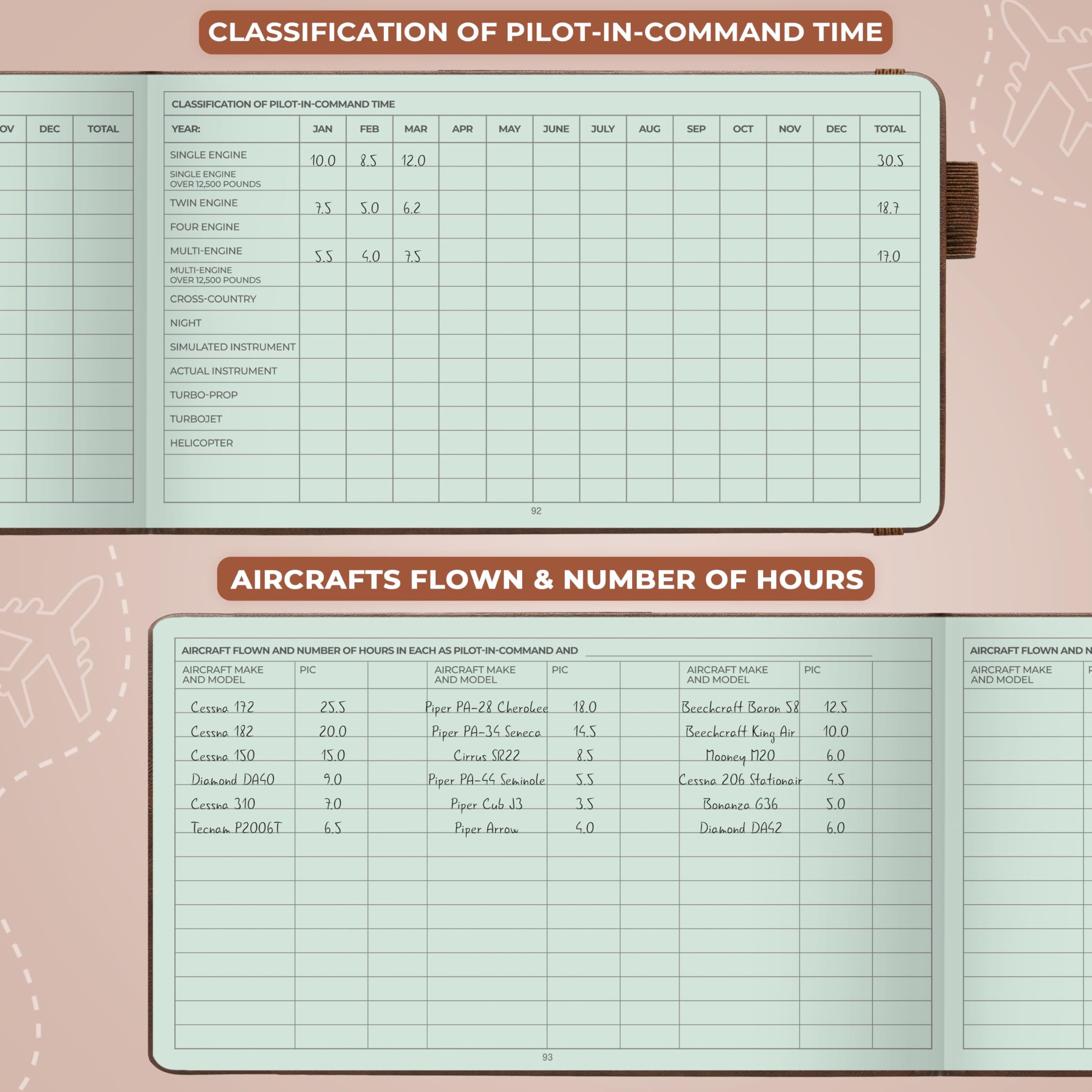 ALL-IN-ONE PROFESSIONAL PILOT LOGBOOK – This flight log book for pilots features dedicated sections to record flight hours, certificates, ratings, ground school classes, endorsements, and more, ensuring effortless and comprehensive tracking.