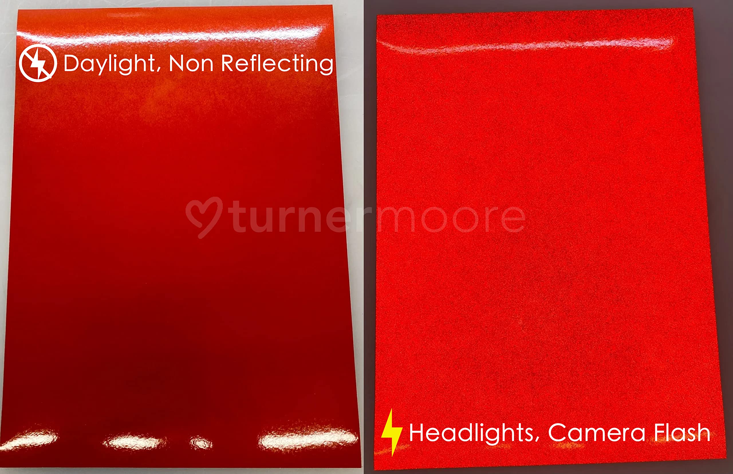 REFLECTIVE SAFETY & MULTI PURPOSE. 3 sheet bundle of 12"x12" red reflective vinyl adhesive. The Turner Moore Edition engineering grade reflective vinyl is designed for use on commercial and traffic signs. It is highly visible during both day and night, and contributes greatly to driving safety. Ensure high visibility while walking, driving, or cycling at night. Our reflective material can also be used for crafts and various residential home uses.