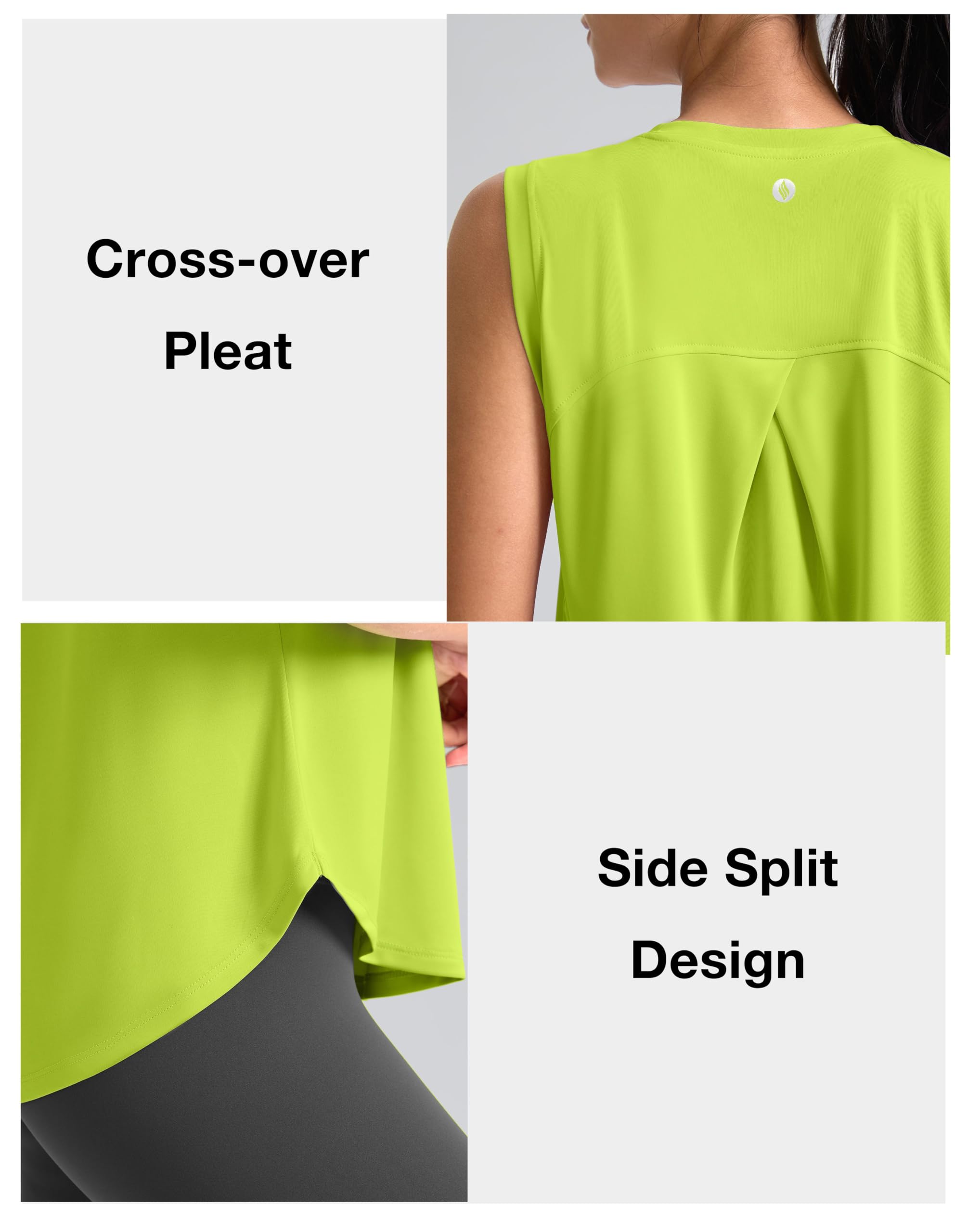Back Cross-over Pleat: Our athletic tank drapes beautifully thanks to the cross-over pleat at back yoke. The crossing detail is cute and flattering, engineered to keep the top from clinging to your sweaty body while running.