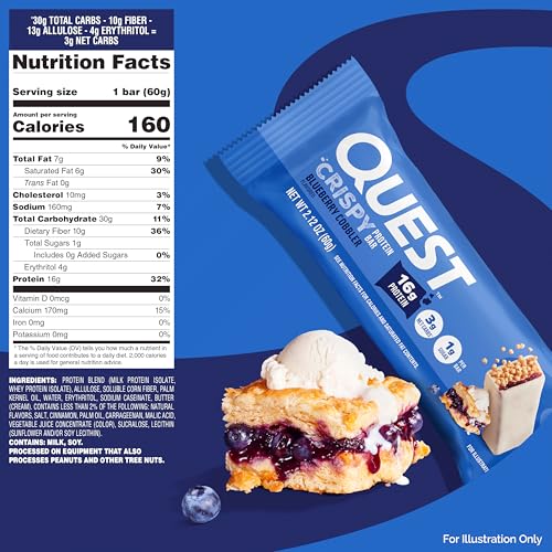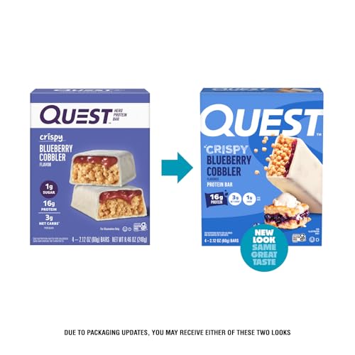 HACK YOUR SNACK. Quest Blueberry Cobbler Flavored Crispy Protein Bars have a white chocolatey coating outside, chewy and crispy crunch inside—and the sweet taste of blueberry cobbler with 1g of sugar, and 3g of net carbs*.