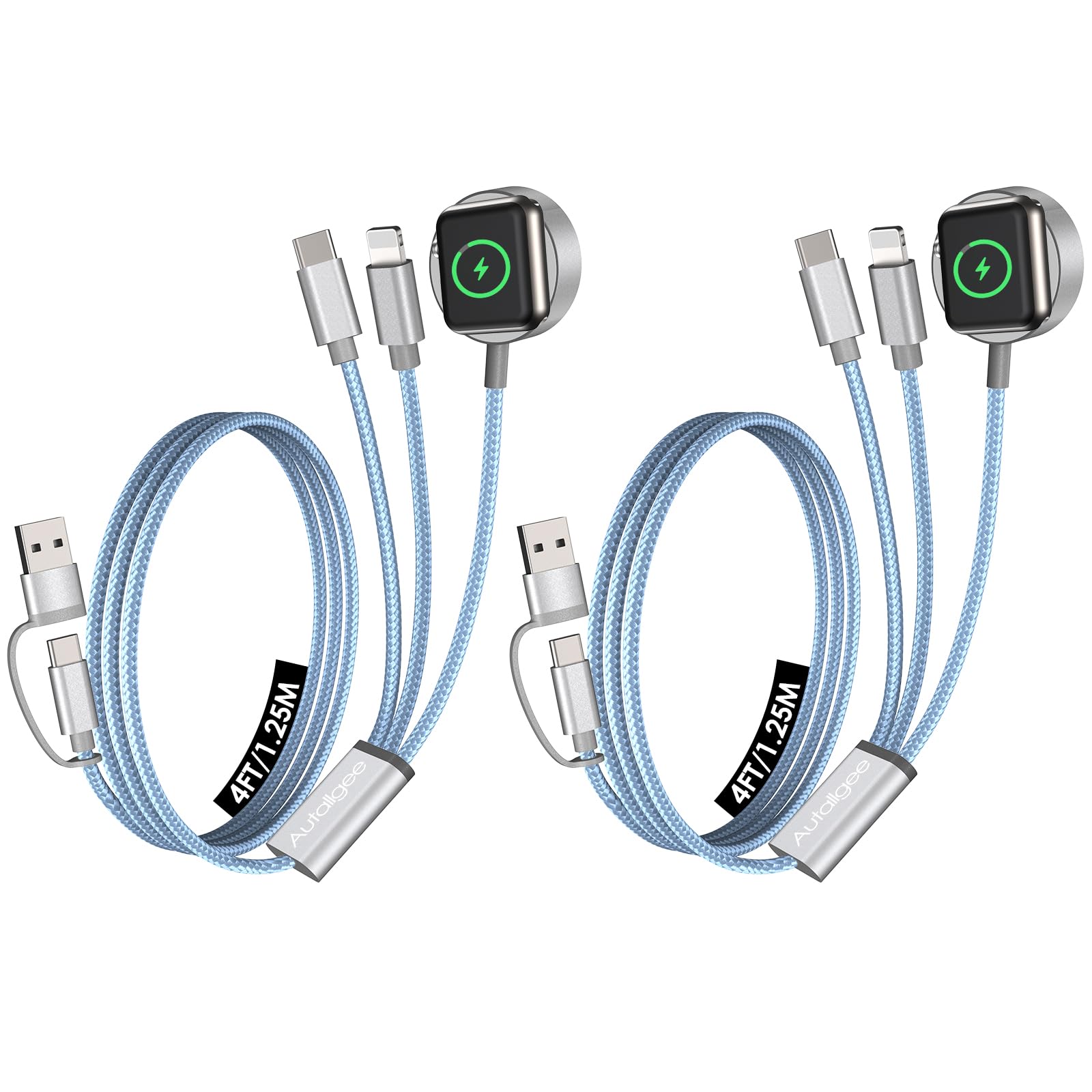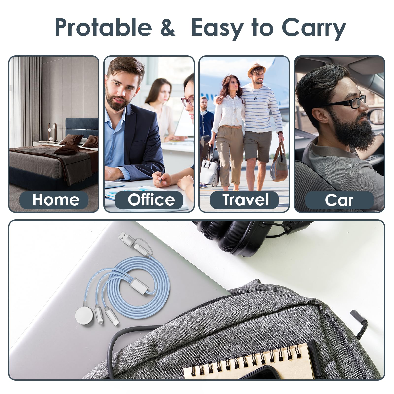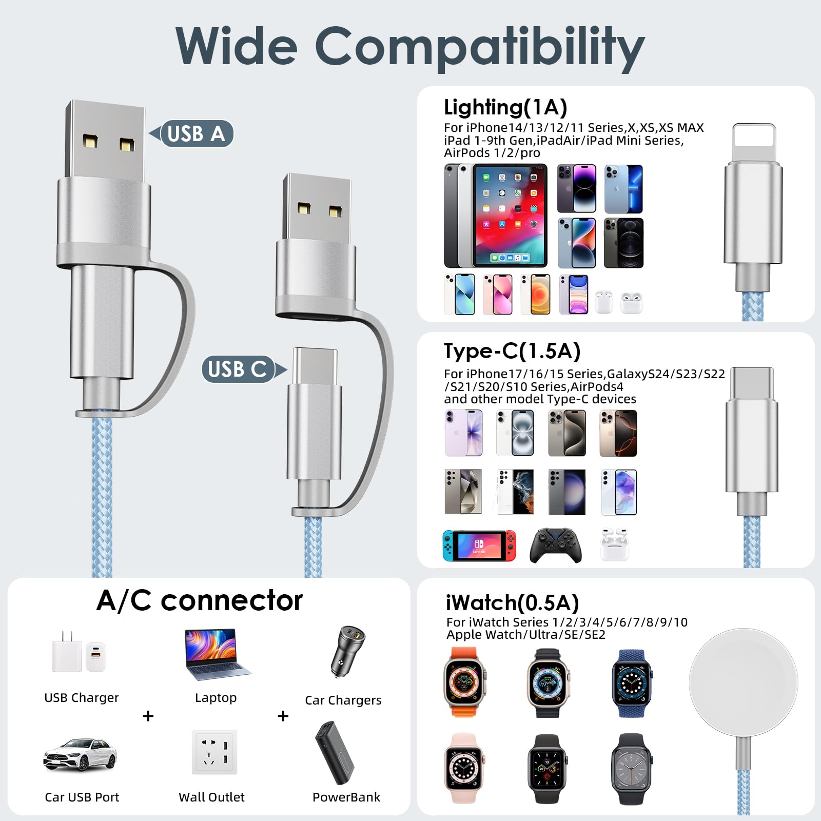 【3 in 2 Multi Charging Cable】Includes 2 charging cables that features USB C/USB A input ports and three output ports: Type-C, Lighting and for apple watch charger.The multi charger cable is compatible with both USB C and USB A chargers, making it a versatile option for various devices(designed for iWatch Series 2-10,SE/Ultra models,compatible with Phone 17-11 and newer models,and alos for iPads,Samsung Galaxy S25-21,Airpods,car charging etc.)