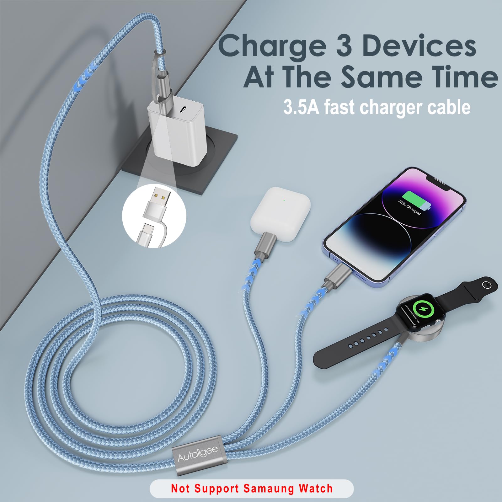 【Portable Travel Essentials&Car accessories】This 1.25M/4ft 3 in 2 charging cable is convenient to carry around with lightweight and portable design.It fits seamlessly into travel essentials like bags and suitcases so it is a perfect choice when going on holiday,business trip,travel,office,dorm life,apartment living, college campuses,and hiking adventures. Ideal for charging in car,Charge Phone, iWatch, and USB A to C cable-compatible devices simultaneously.