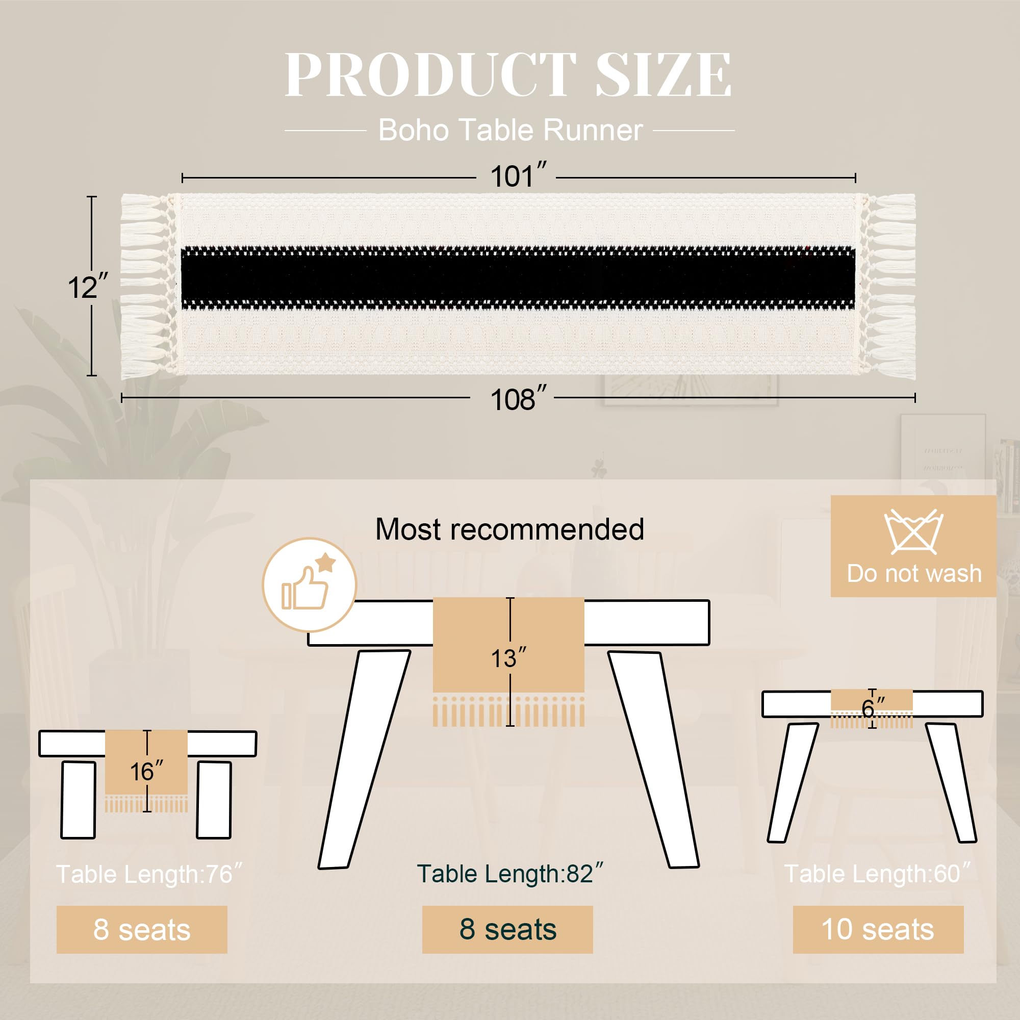 [Perfect 108 Inches Long] Our macrame table runner with tassels measures 12 x 108 inch, fits a dining table that seats 4-8 people. It can give your tables a rustic and boho look. (Because it is folded in the bag, when you take it out, the table runner will have creases, which will affect your measurement. So, please make sure the table runner is placed neatly and flat before measuring)