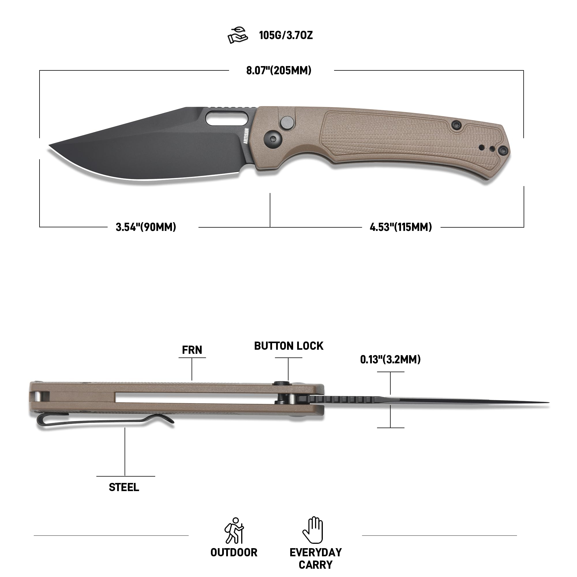 Accessible and Portable: Weighing 105g/3.7oz and its closed length of 4.53", this pocket knife is accompanied by a convenient pocket clip. Enjoy easy access on the move, whether clipped to your gear, attached to your belt, or discreetly stored in your pocket
