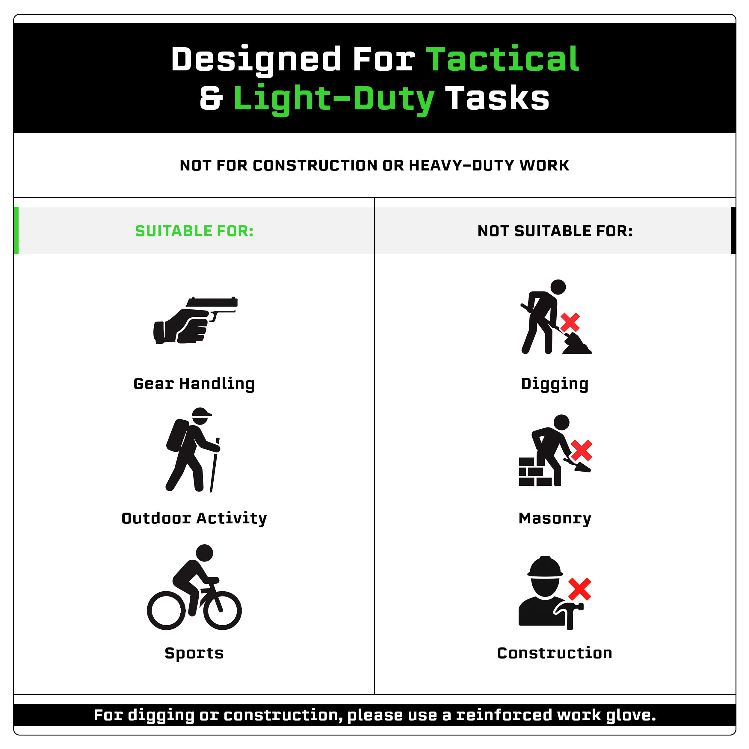 TACTICAL PERFORMANCE: These high dexterity work gloves are built with premium materials for maximum durability; engineered for tactical and light work, not for heavy-duty use; for digging or construction, we recommend a reinforced work glove