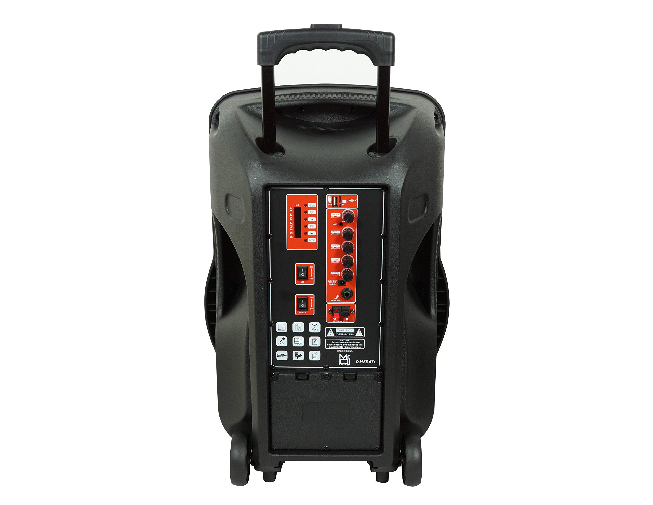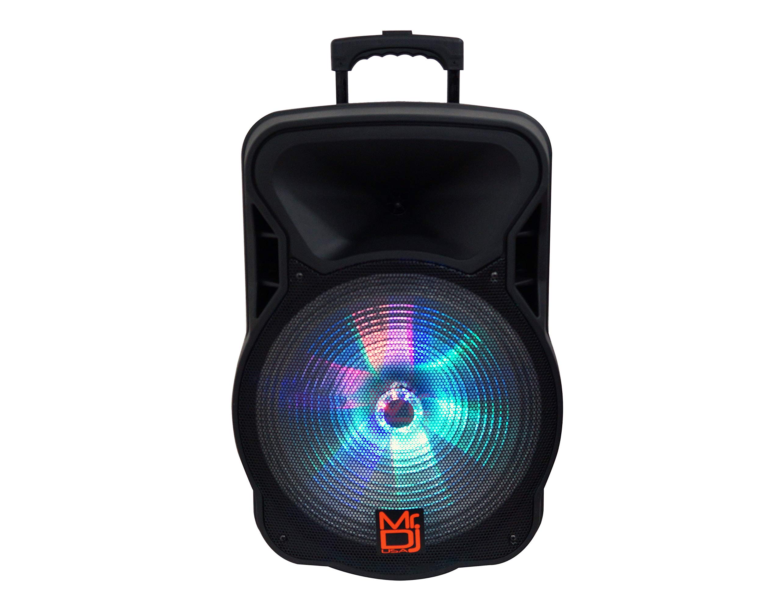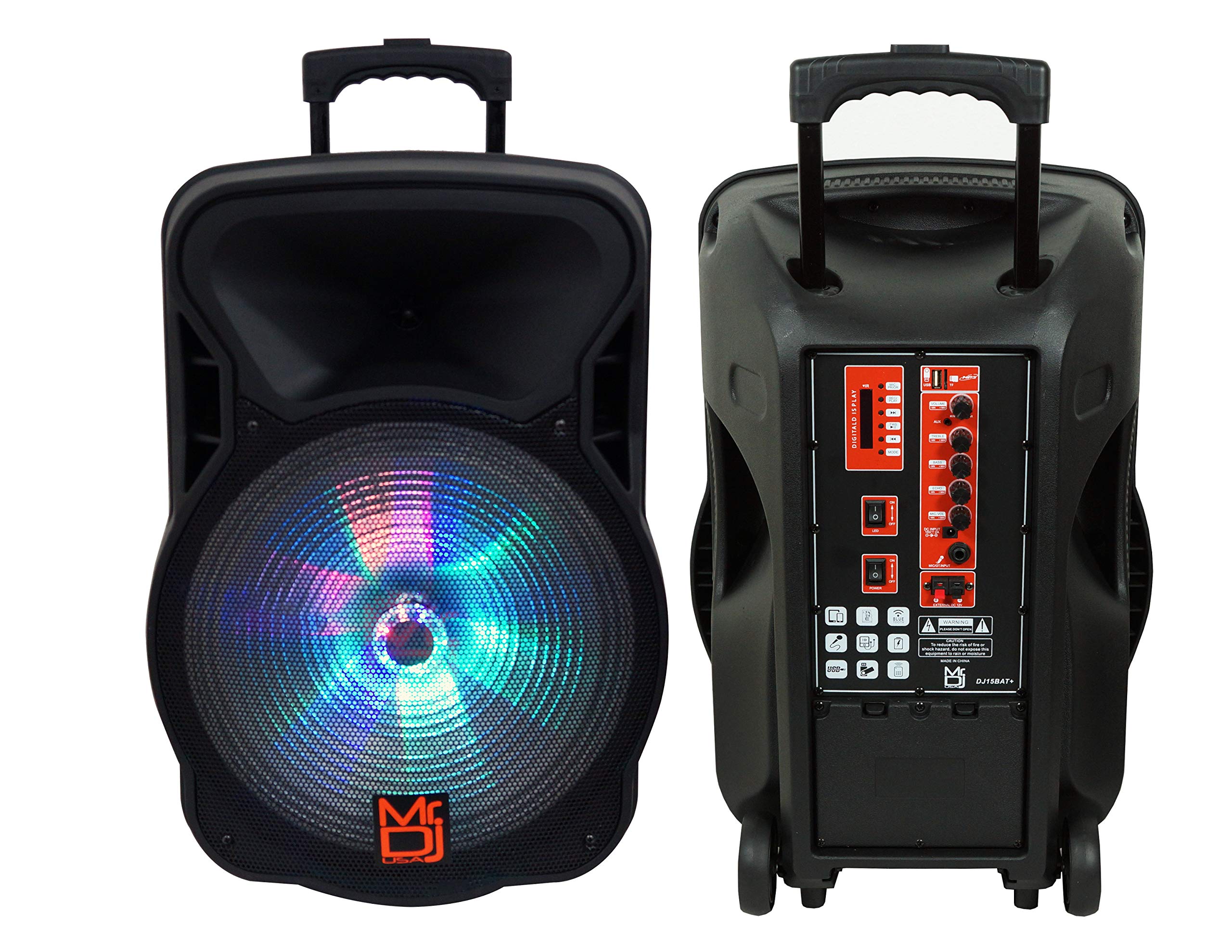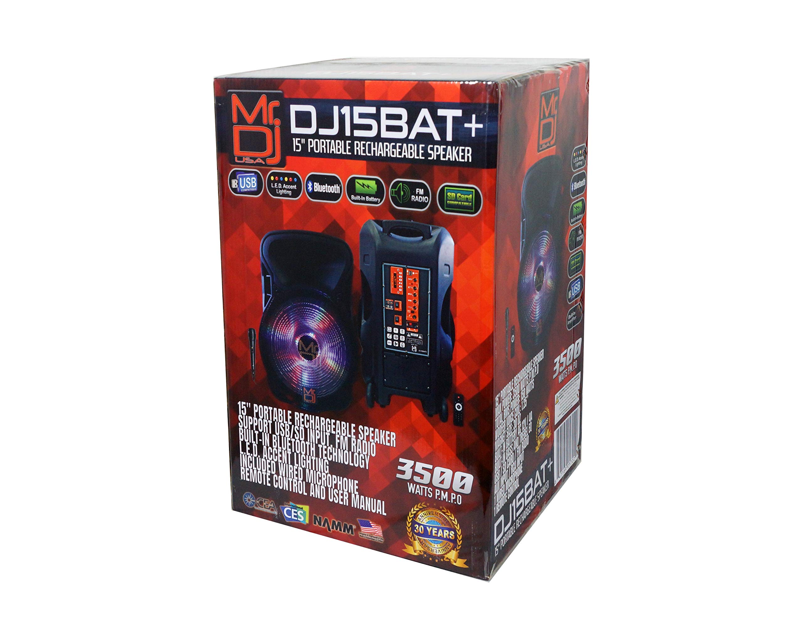 Mr. Dj DJ15BAT+ 15" Portable Trolley PA DJ Active Powered Bluetooth TWS Speaker 3500 Watts P.M.P.O LCD/MP3/USB/micro SD 15" Portable Active Speaker With Rechargeable Battery 3000 Watts P.M.P.O, Built-In TWS Bluetooth Technology, It Can Stream Music From Bluetooth-Enabled Devices, And Through USB, Or Can Be Connected With A Cable Through The Aux-In Port., USB Card Reader, Fm Radio, RGB Party Led Lights, Microphone In 1/4” Jack, Aux-In For Allows You To Connect An External Audio Device, Mode Accent Lighting, Led Screen Display And Grill-Covered Speakers And Equipped With A Handle For Easy Transportation. The Speaker Also Has A Microphone Input for Karaoke. The Rechargeable Battery Lasts for Hours So You Can Stream Music Even In Places Without An Outlet Nearby. General Features: 15-inch 3000 Watt max power speaker with built-in Bluetooth Built-In TWS rechargeable battery LCD/MP3/USB/micro SD slot 15" 2-way speaker 3500 watts max p.M.p.O. 1.30" voice coil 35mm dome driver 30 oz. magnet RMS power 120W with LED Accent lighting LCD Display aux input Remote Control 1 mic input, echo effect external DC Inc. light power switch include a microphone with 25ft cord Dynamic, Powerful Sound 15-inch woofer and wide-dispersion tweeter deliver clear, lifelike sound; a 120-watt peak power amplifier pumps up the volume and a Bass Boost button instantly cranks up the low end Ultra-Portable Centrepiece For Your Gathering - Rugged plastic enclosure featuring a telescoping handle, wheels, and two conveniently located carrying handles; Plus, a microphone is included for public speaking, karaoke, and more Long Life Battery 4-8 hour rechargeable battery for non-stop fun Warning: Cancer and Reproductive Harm