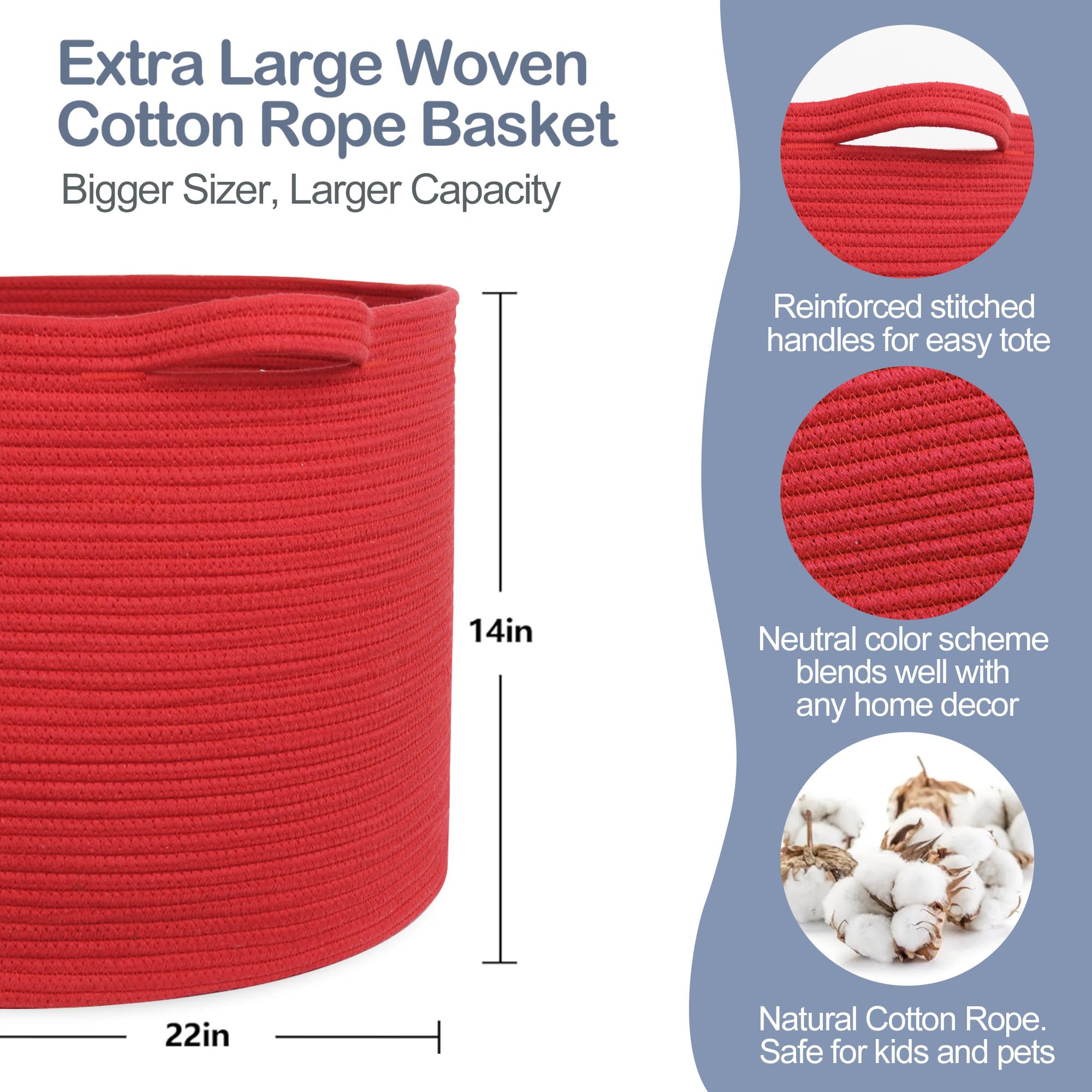 SOFT COTTON ROPE BASKET: The red fabric basket is braided from natural cotton rope, making it a super soft but sturdy, textured bin. The red bedroom decor storage basket is huge and doesn't have a smell at all. No hard edges are safe for your kids allowing them to climb into these wick basket and won't scratches or damage the floors.