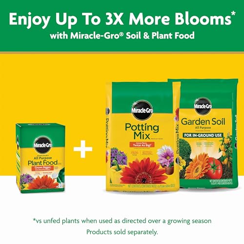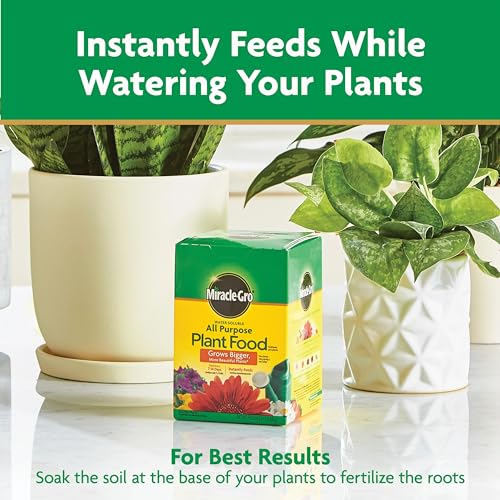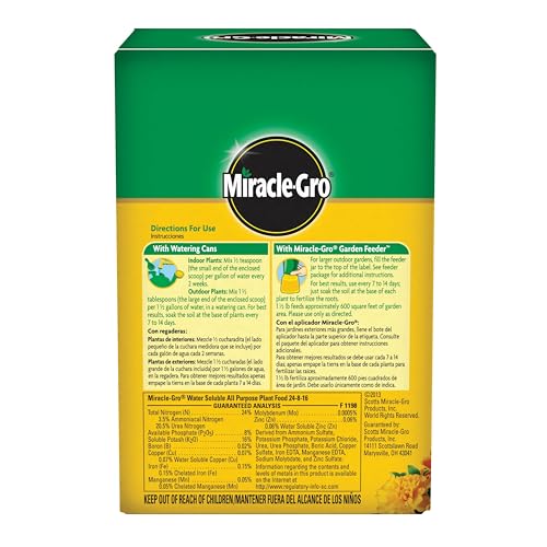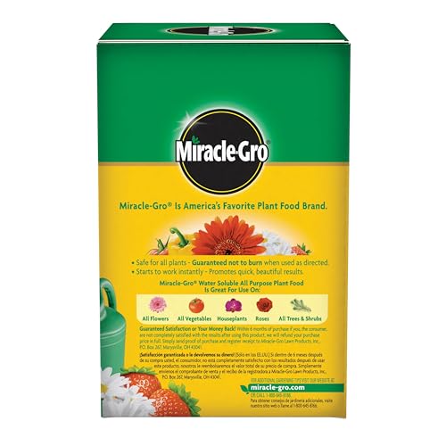 Grow bigger and more beautiful plants with Miracle-Gro Water Soluble All Purpose Plant Food (vs unfed plants). This gardening product feeds plants instantly. In addition, it's safe for all plants and won't burn plants when used as directed. Use with all types of indoor or outdoor plants, including flowers, vegetables, houseplants, roses, trees, and shrubs. This plant food may be used with container plants or in-ground gardens. To apply to indoor plants, use the small end of the included scoop (1/2 tsp) and mix plant food with 1 gallon of water in a watering can. Reapply every 2 weeks. For outdoor plants, use the large end of the included scoop (1 1/2 tbsp) and mix with 1 1/2 gallons of water in a watering can. Reapply every 7 to 14 days. When using in large garden areas, fill a Miracle-Gro Garden Feeder (sold separately) and follow feeder directions. For best results, just soak the soil at the base of each plant to fertilize the roots. One 1.5 lb. Container of Miracle-Gro Water Soluble All Purpose Plant Food feeds approximately 600 sq. Ft. Of garden area.