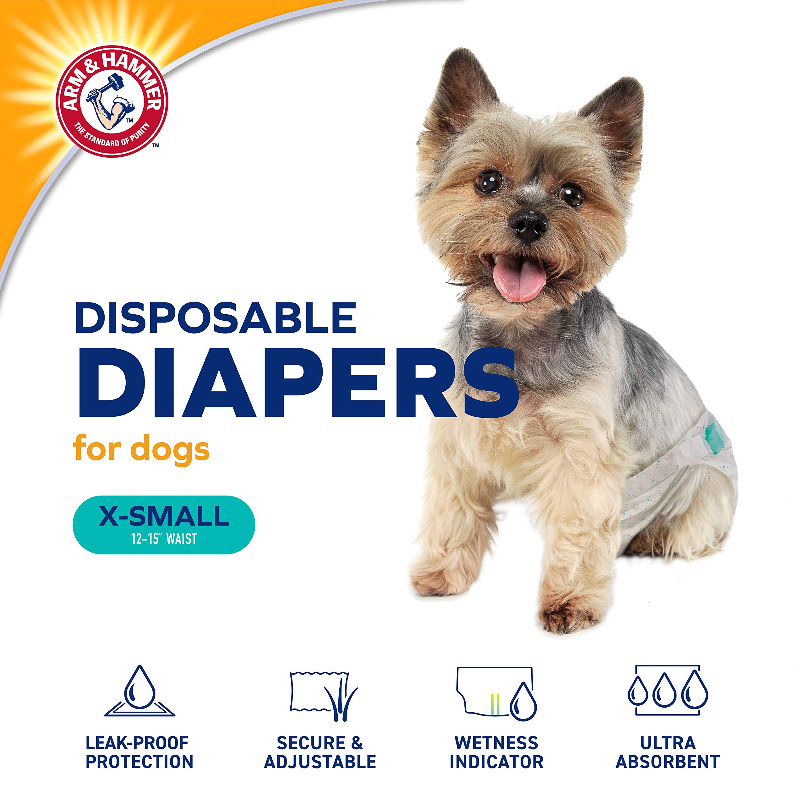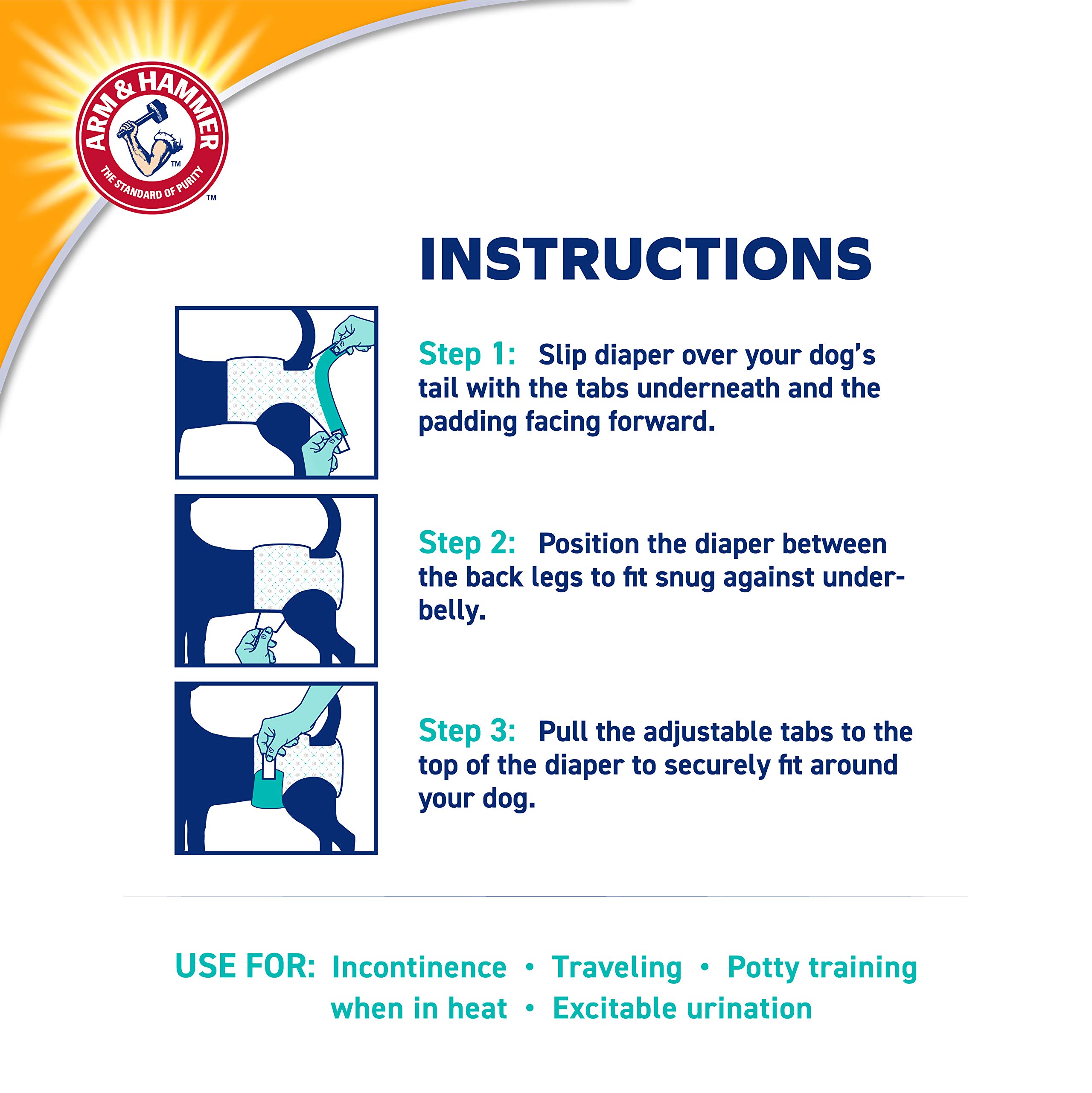 ULTRA-ABSORBENT DOG DIAPERS — Arm & Hammer diapers for female dogs will keep your home dry. These absorbent and leak-proof diapers provide superior protection for dogs that experience incontinence, excitable urination, or when she wants to leave a mark