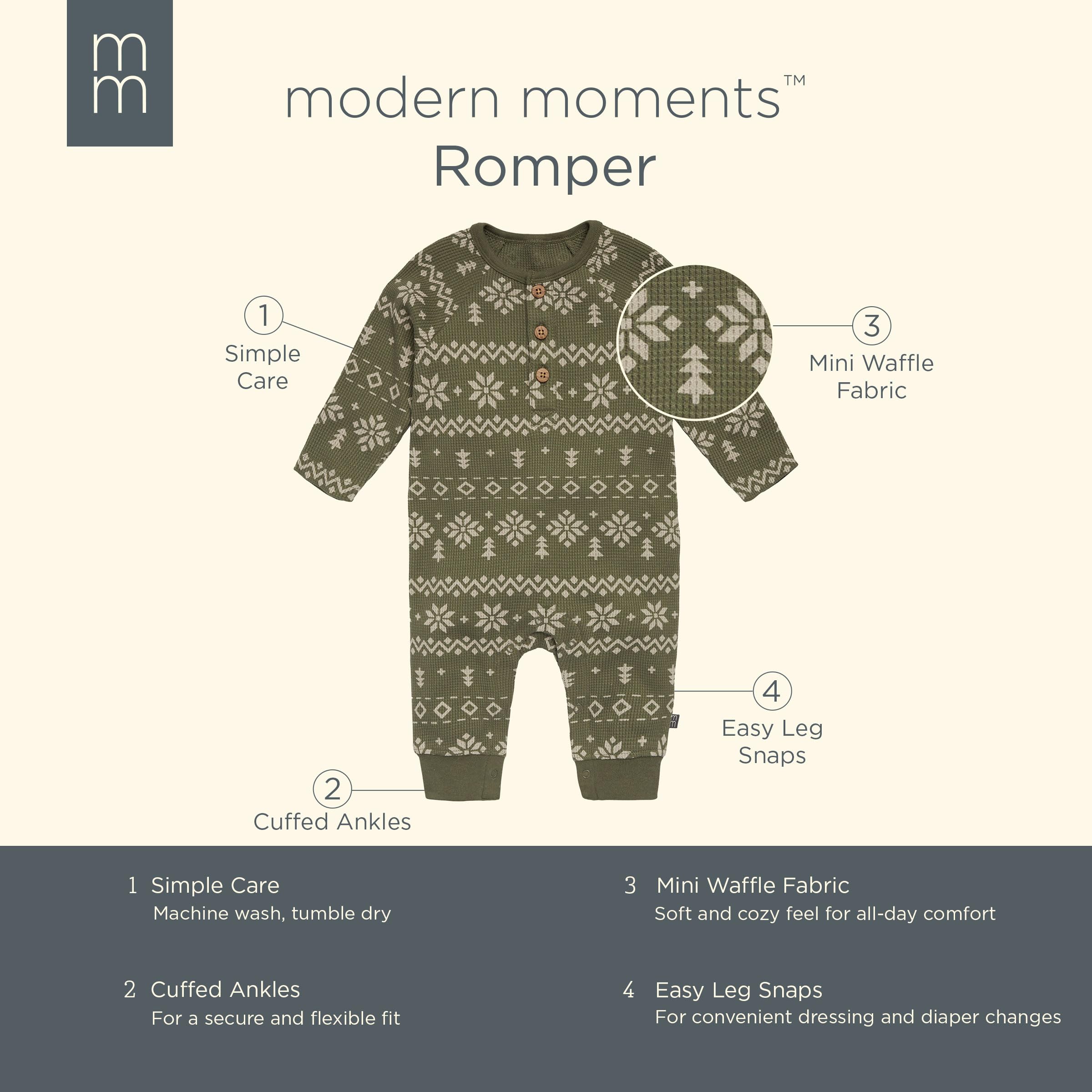 Description Our baby or toddler romper, crafted primarily from soft cotton with spandex for a slight stretch, is the perfect choice for snuggles or play time with your little one! The cozy feel is perfect for cooler days, ensuring your little explorer stays snug and happy all day long. Convenient leg snaps make it easy to complete diaper changes without removing the entire outfit, and Henley-style faux wood buttons enable slight adjustments to the fit. An ideal choice for fall and winter, the romper is machine washable so you can keep it clean and ready to wear all season long.