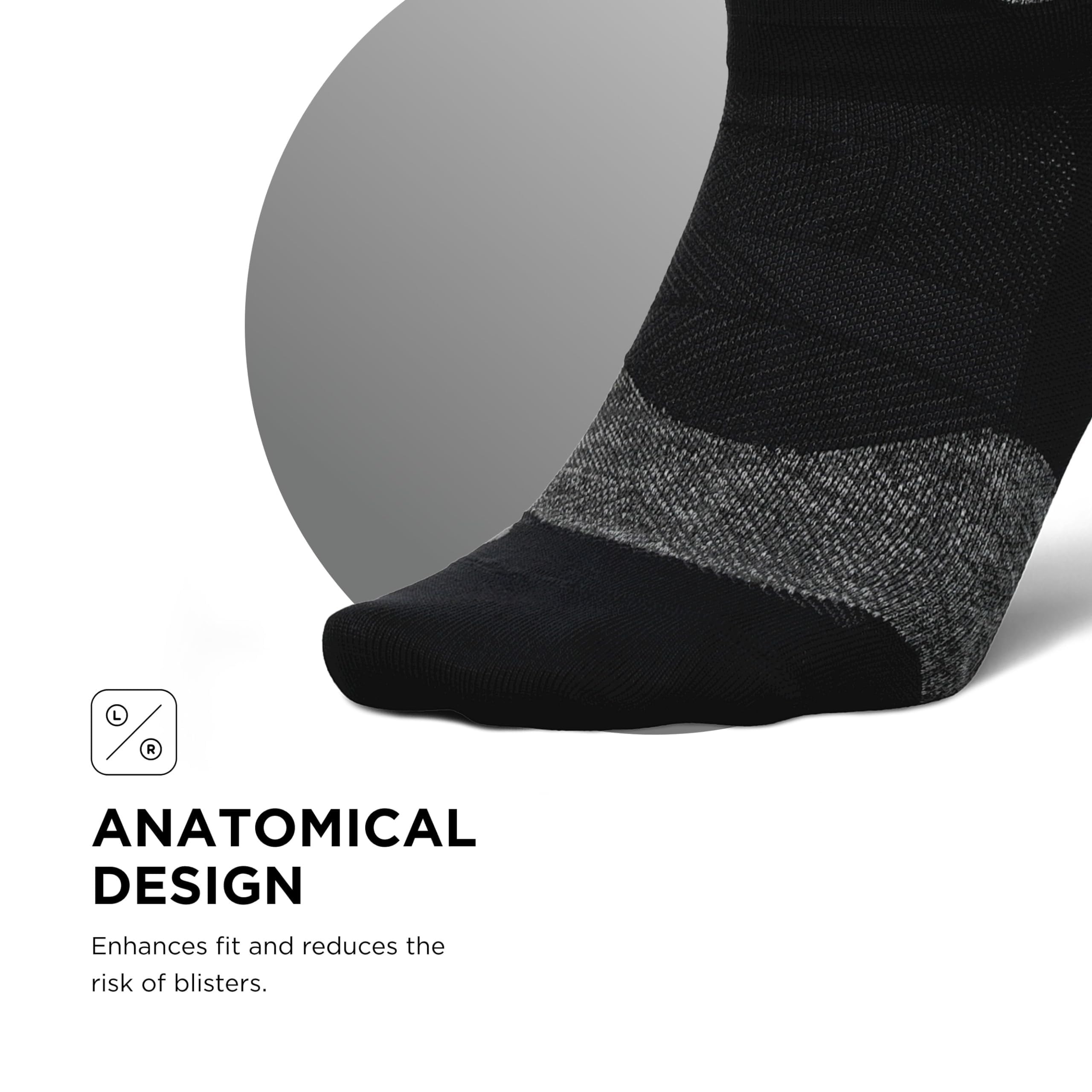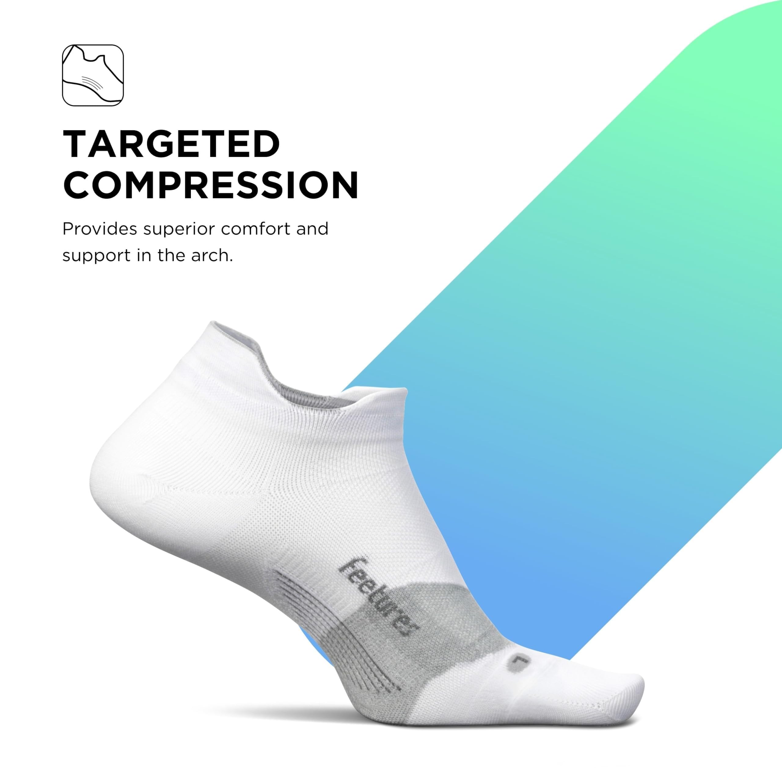 Sports Sock: These Feetures socks are engineered with Targeted Compression and anatomical design that conform to the left and right structure of the foot providing a custom-like fit and reduced risk of blisters
