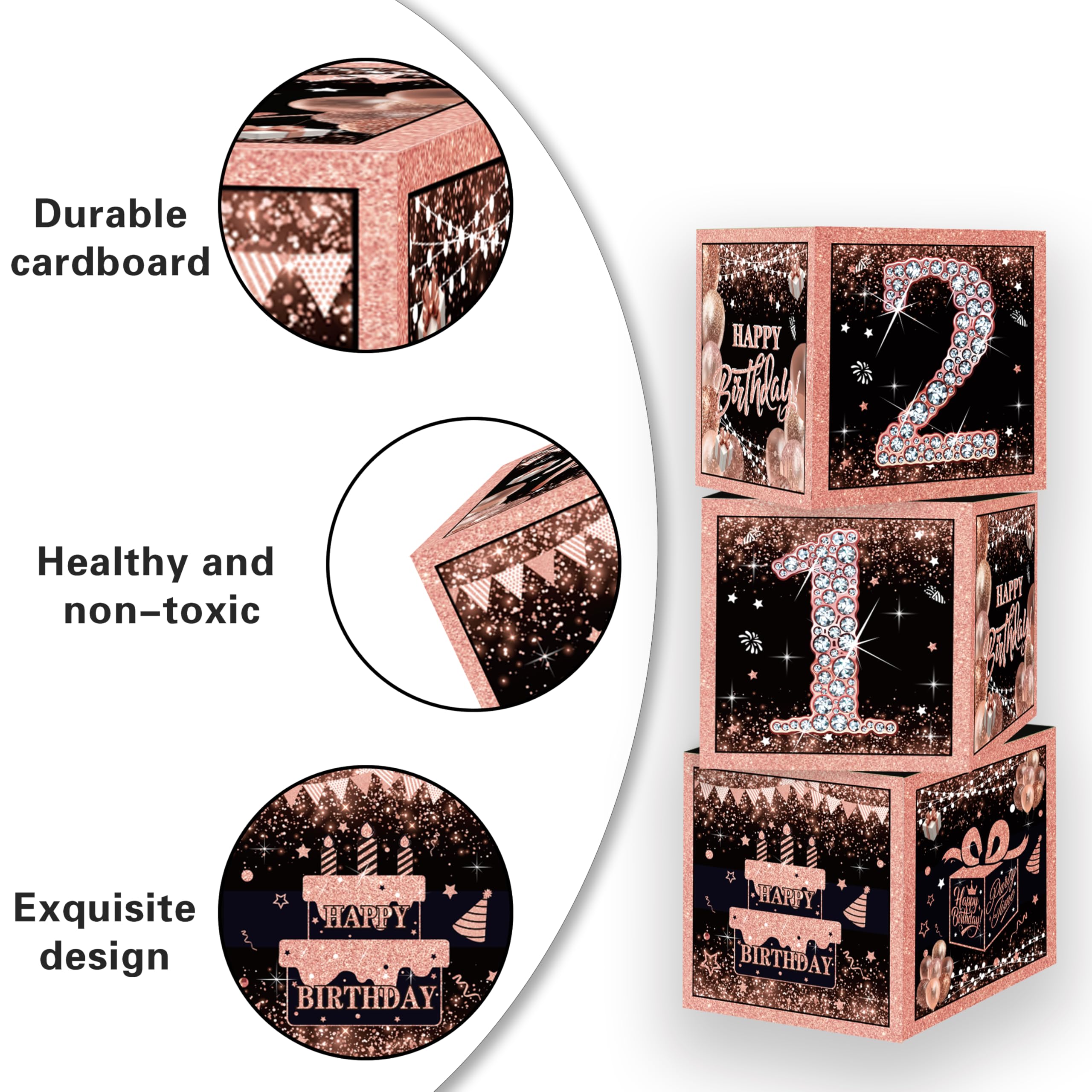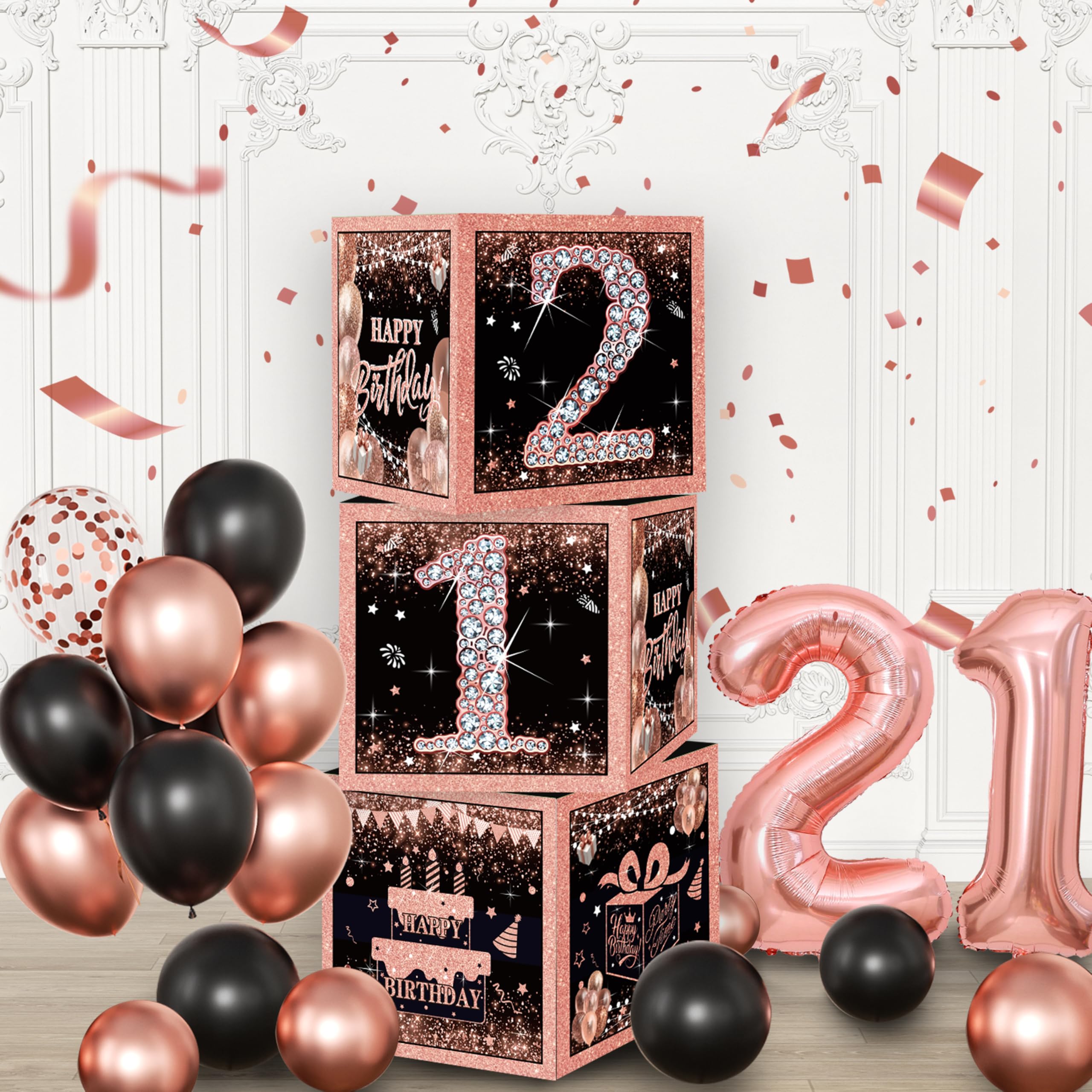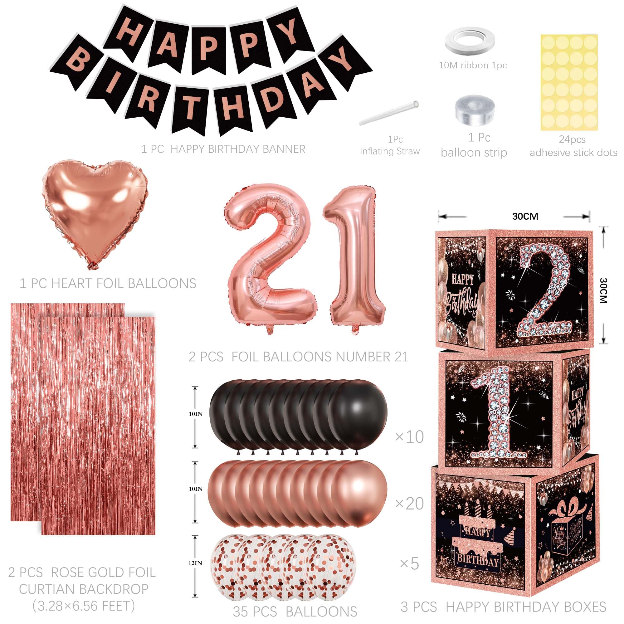 Celebrate a momentous 21st birthday with our exquisite Rose Gold Birthday Party Decorations Kit, specially curated for women and girls. This all - in - one set combines elegance with festivity, featuring a stunning array of black and rose - gold elements. The kit includes 2 rose - gold foil curtain backdrops (3.28×6.56 feet) to create a glamorous backdrop, 1 “HAPPY BIRTHDAY” banner for a classic birthday touch, 1 heart - shaped foil balloon, 2 large number “21” foil balloons, 35 high - quality balloons (10 black, 20 rose - gold, 5 confetti - filled), and 3 beautifully designed “HAPPY BIRTHDAY” boxes (30CM×30CM). Additionally, accessories like a 10M ribbon, inflating straw, balloon strip, and 24 adhesive stick dots ensure easy setup. Perfect for creating a memorable and stylish birthday celebration!
