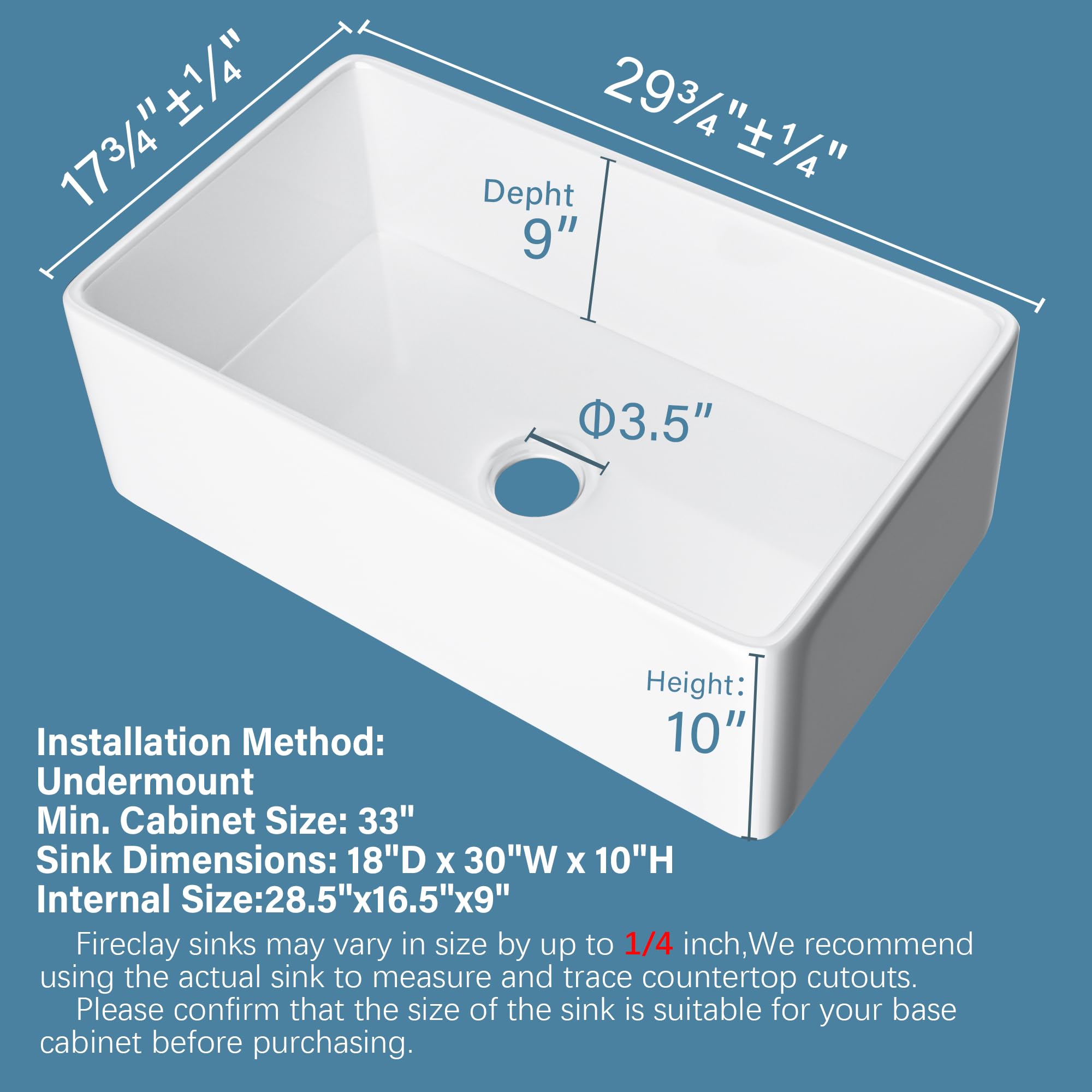 【Installation Requirements】In order to successfully install this farmhouse sink 30 inch, the minimum size of the cabinet from left to right is 33 inches, the minimum size of the cabinet from front to back is 21 inches.The weight of the fireclay sink is very large. You need to pay attention to the adequate support of the farm sink.