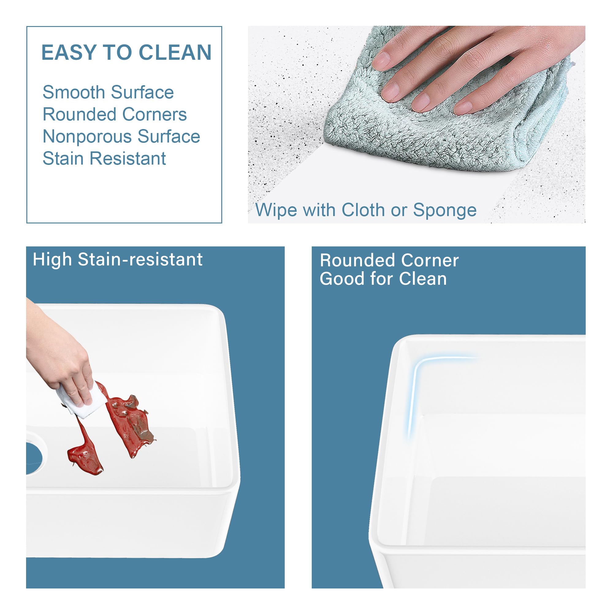 【Easy to Clean】The smooth white surface of the farmhouse sink makes it difficult for food residue to adhere, We can clean the apron sink with sponge or cloth. and thanks to the rounded corners of R10, This farm sink for kitchen is very easy to clean.