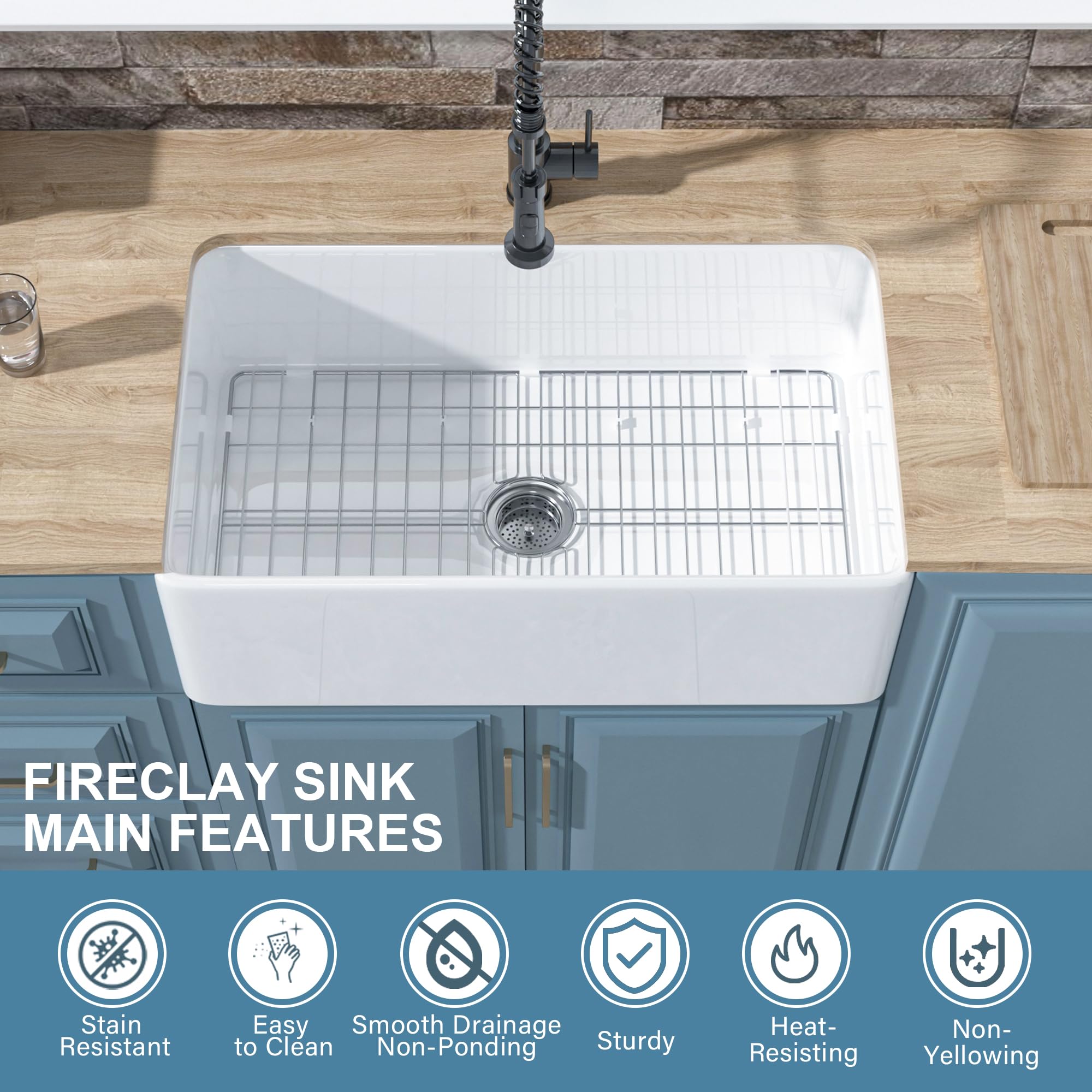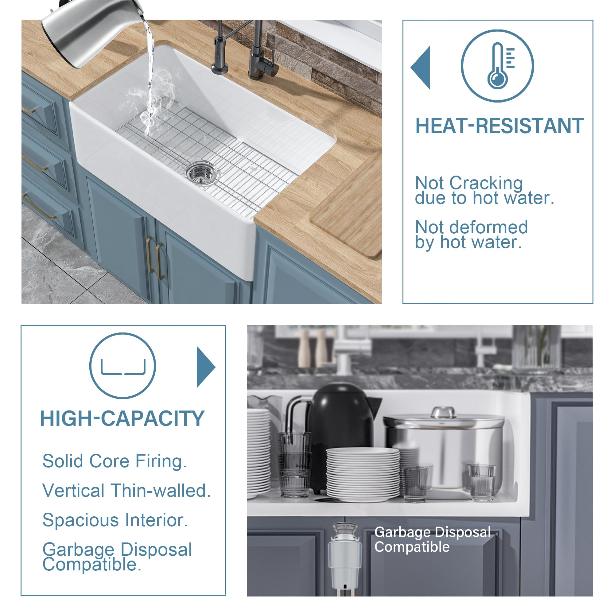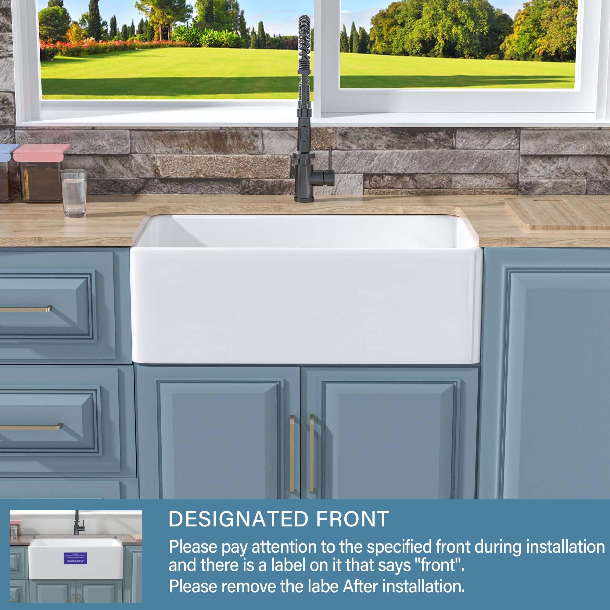 【Sleek Front, Heavy Duty Fireclay Sink for Kitchen & Barn】The front of the farmhouse apron sink 30 Inch is smooth, with a pure white glaze, making the farm sink look gorgeous and easy to clean.It is a heavy-duty fireclay sink weighing over 60 pounds, It is recommended to have two people move together.