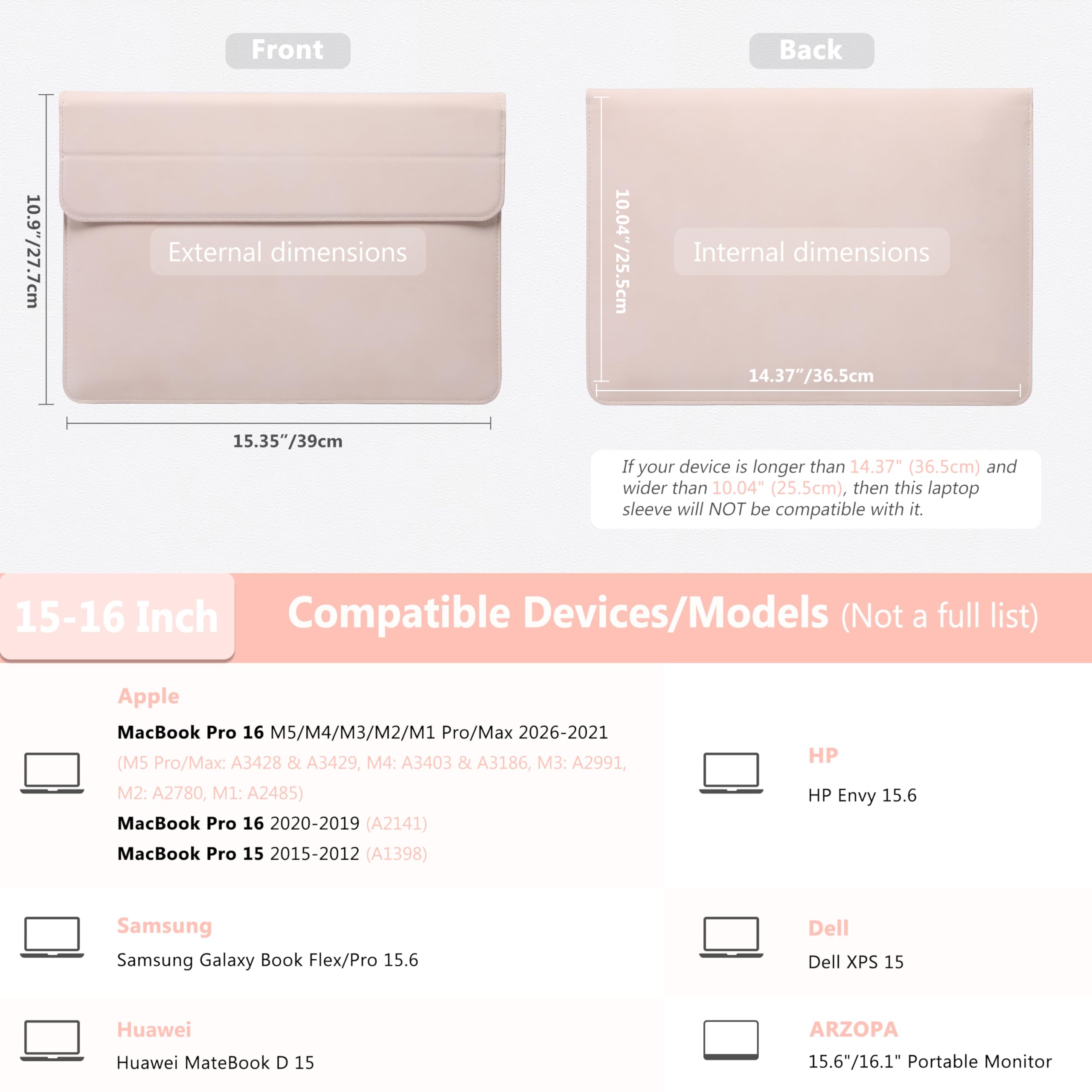 Internal Dimensions: 14.37" x 10.04" (36.5 cm x 25.5 cm). Compatible with MacBook Pro 16 M5/M4/M3/M2/M1 Pro/Max 2026-2019 (A3428, A3429, A3403 A3186 A2991 A2780 A2485 A2141), Compatible with MacBook Pro 15 2015-2012 (A1398), Compatible with Dell XPS 15, Compatible with HP Envy 15.6, Compatible with Huawei MateBook D 15, Compatible with Samsung Galaxy Book Flex/Pro 15, Compatible with ARZOPA 15.6"/16.1" Portable Monitor, etc.