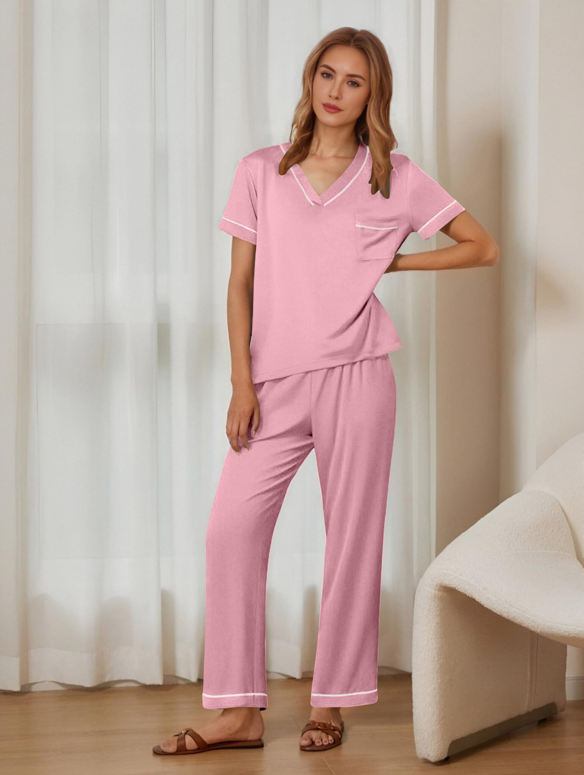 SHORT SLEEVE TOPS: V neck matching outfits sets with a contrasting lines at neckline. The sleepwear tops has pockets on the chest for an added layered feel