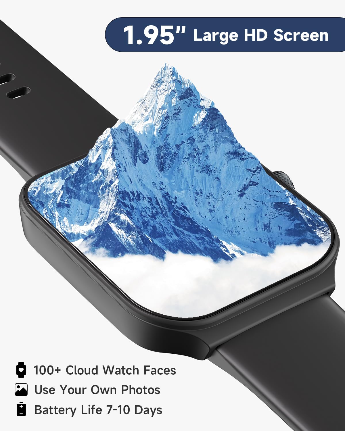 [1.95'' HD Screen & Customizable Watch Face] Experience crystal-clear visuals like never before with our smartwatch's 1.95-inch high definition screen. Choose from 100 beautiful cloud-based watch faces or even upload your own photos, such as selfies or pictures of your pets, to create a truly personalized look. With endless possibilities, you'll never run out of options to make your watch truly your own.