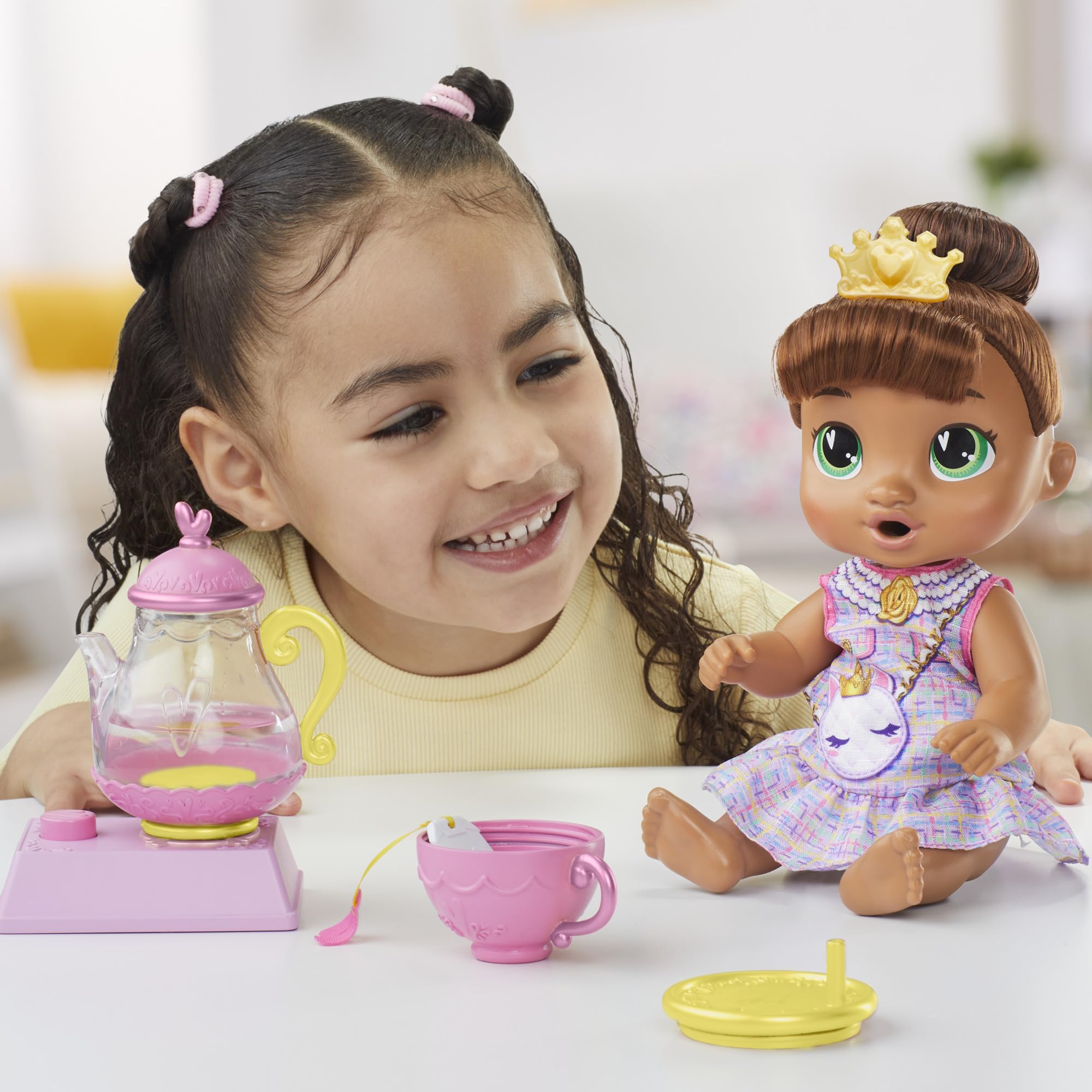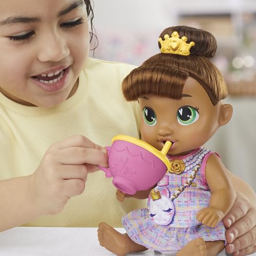 Sophia Sparkle is ready for a magical tea party with the Baby Alive Bubbly Tea Party baby doll set! Fill the tea kettle with water and place it on the toy stovetop to imagine getting ready to make tea. Then, press the button to make the water bubble! Kids can host their own imaginary tea party with included teacup and teabag accessories. After Sophia drinks her pretend tea, it's time for a diaper change! Comes with 1 Baby Alive diaper (refills sold separately). Sophia has soft hair and removable unicorn -themed doll clothes. Imagine tea party fun with Baby Alive playsets and dolls for girls and boys! Baby Alive and all related properties are trademarks of Hasbro.