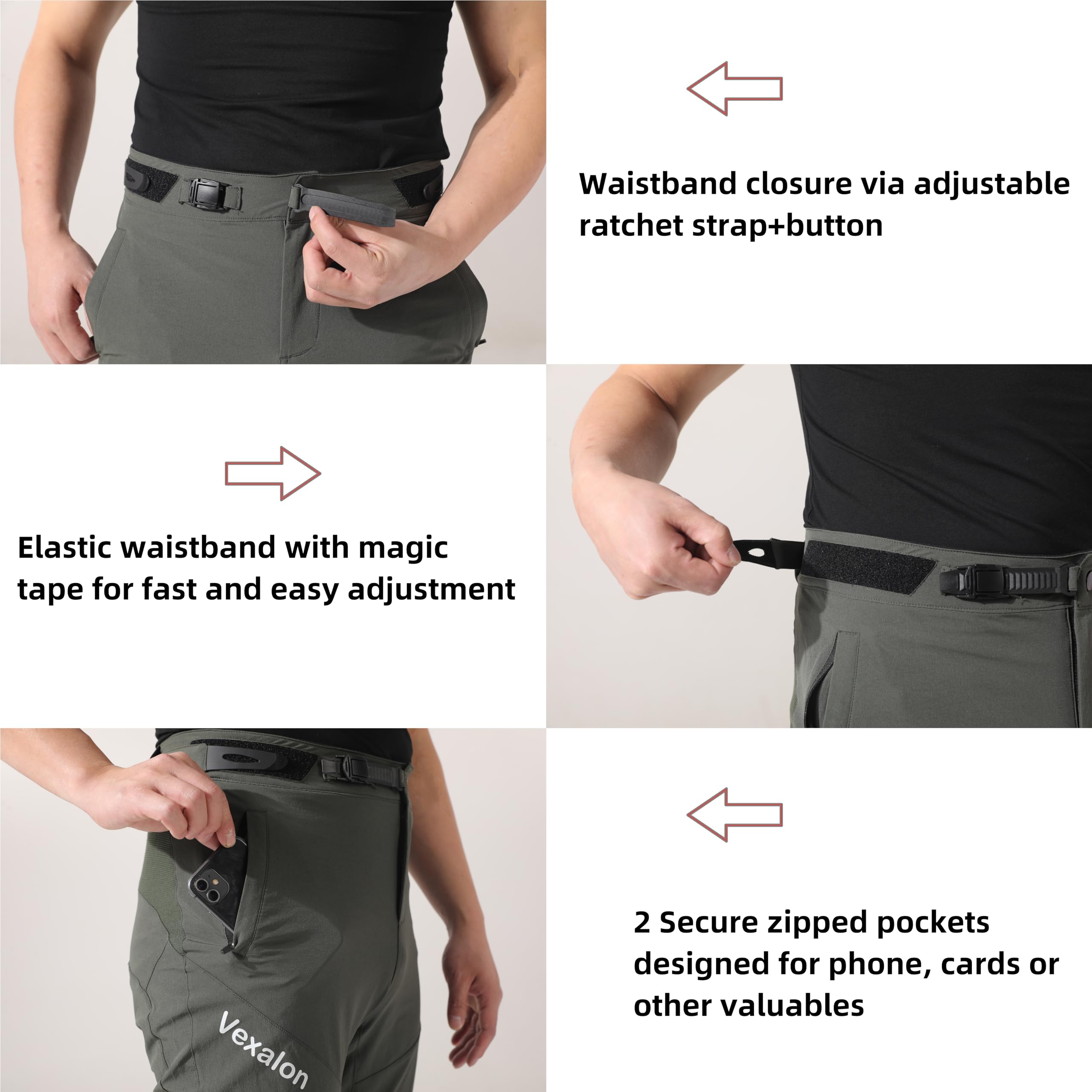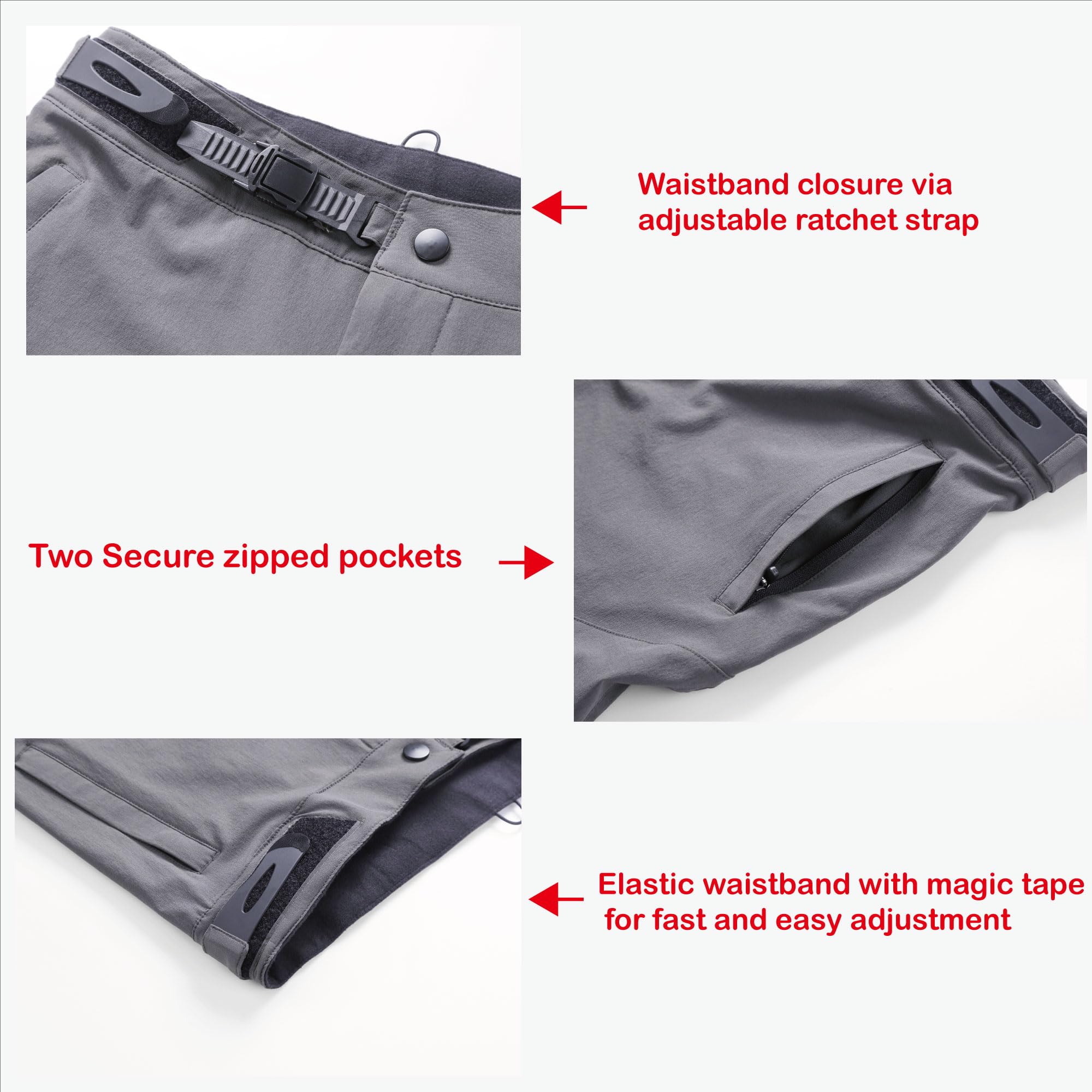 【Adjustable Waist Design】: These Bmx pants have Waistband closure via adjustable ratchet strap combined with Velcro, it is more convenient to adjust waist size, Great double protection.two side zipper pockets are designed for phone, cards or other valuables.