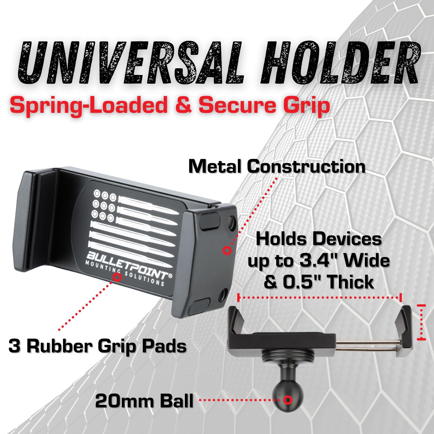 HIGH QUALITY METAL CONSTRUCTION. You won't find any plastic here! Our spring-loaded phone holder is made from high strength aluminum and features 3 rubberized grips on the inner surface providing a secure grip on your phone. ROCK SOLID GRIP ON YOUR PHONE Bumpy terrain? Potholes? Off-roading? No matter the road conditions, our universal phone holder will keep your phone in place thanks to the spring-loaded mechanism and 3 rubber grips. SINGLE-HANDED OPERATION Once attached, our phone holder only requires one hand to operate. 20mm SYSTEM On the back side of our phone holder is an integrated 20mm (0.787 inches) mounting ball which attaches seamlessly to any of our standard mounting arms. OPENS UP TO 3.4 INCHES WIDE Our universal phone holder is compatible with most iPhone and Android phones.