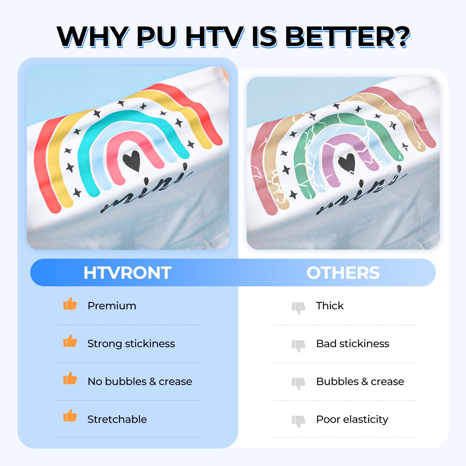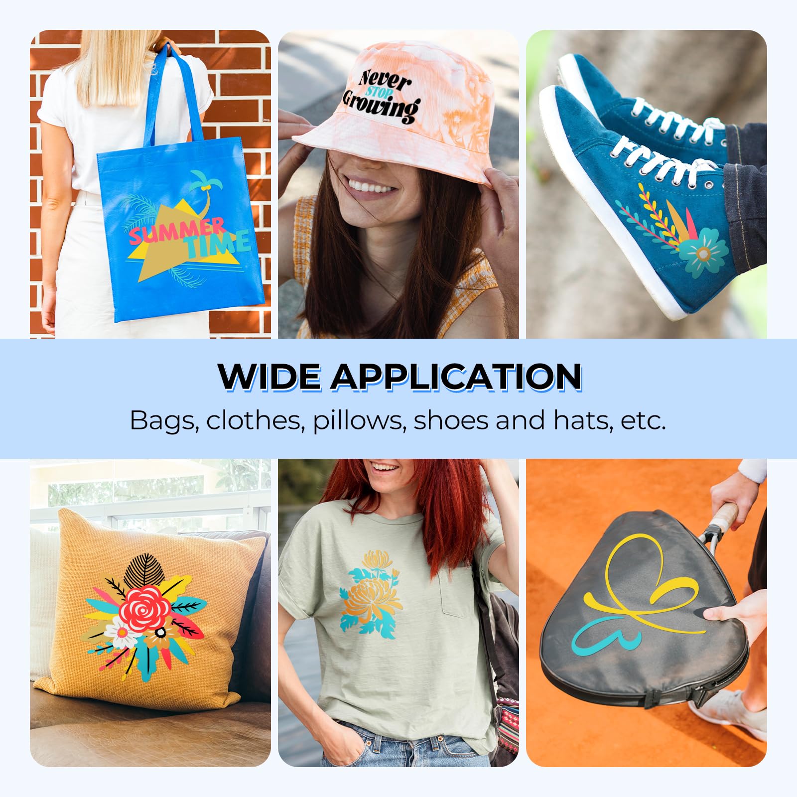 【GREAT STICKINESS & DURABLE】HTVRONT heat transfer vinyl features a high-tack carrier that adheres seamlessly to fabrics. The iron on vinyl roll maintains strong adhesion and durability even after repeated washes, resisting fading, peeling, and cracking. After washing, the htv vinyl retains its color and shape without deformation, while preserving elasticity and flexibility. Tips: cold peel recommended. Reverse wash will be better. Wait 24 hours before its first wash